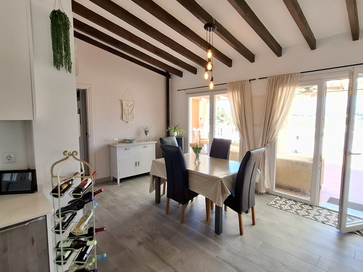 Inside, the home opens into a bright and spacious lounge, full of character with traditional wooden beams and a stunning fireplace—perfect for cosy evenings. Double doors lead out to a private terrace with spectacular views, a built-in bar area, and plenty of space for entertaining or simply unwinding.