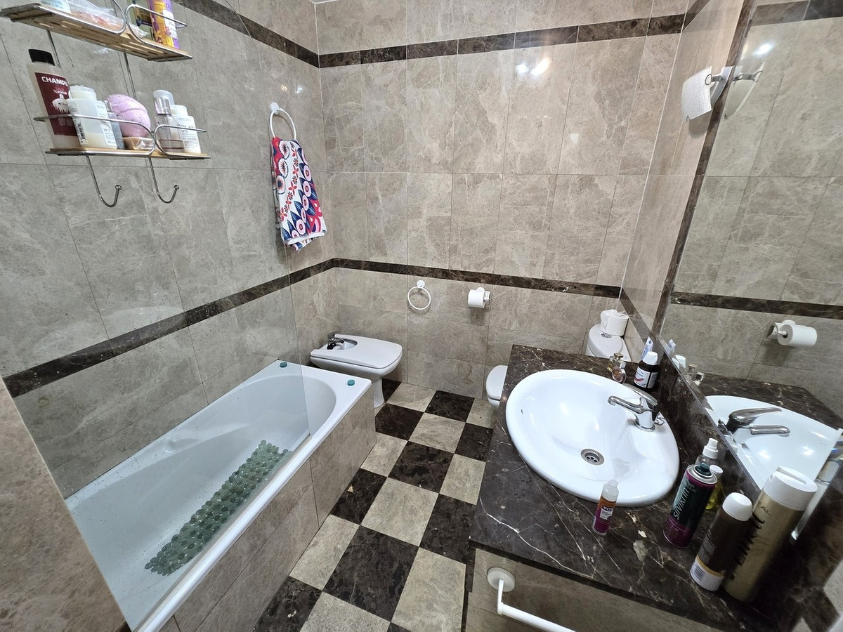 The apartment offers a large double bedroom with an en-suite bathroom, including a bathtub and overhead shower.