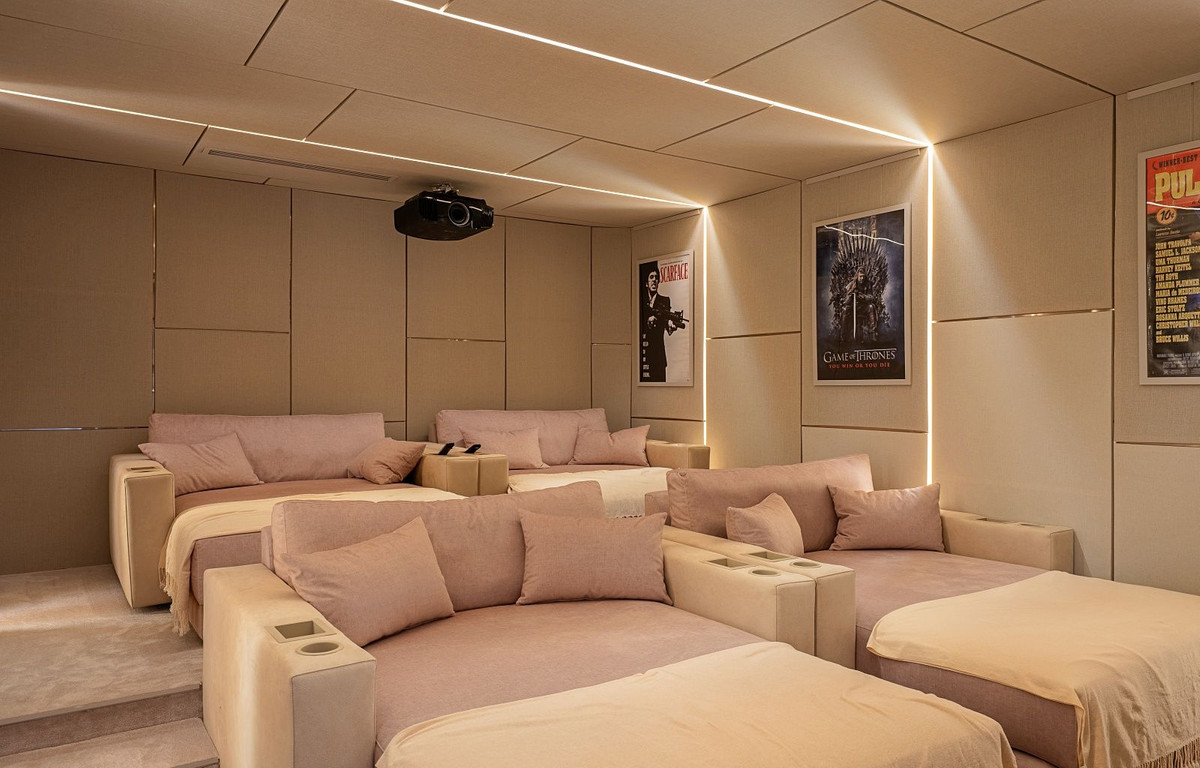 Villans nedre plan erbjuder ett fjärde sovrum med badrum och kompletteras av flera fritidsutrymmen. Här finns bland annat en lekhörna, en imponerande vinkällare, ett biorum och ett fullt utrustat gym. Alla tre våningsplan är förbundna med en privat hiss för extra bekvämlighet.
