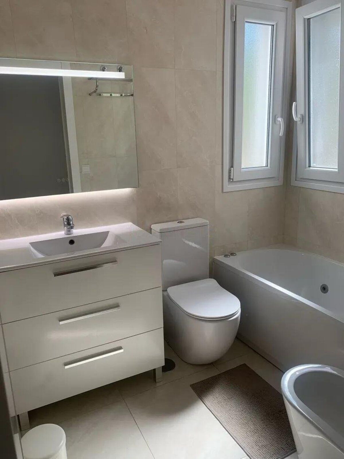 The property has a spacious living/dining room with access to a pleasant terrace. The master bedroom has an en-suite bathroom with a whirlpool bath, while the second bathroom is equipped with a walk-in shower.