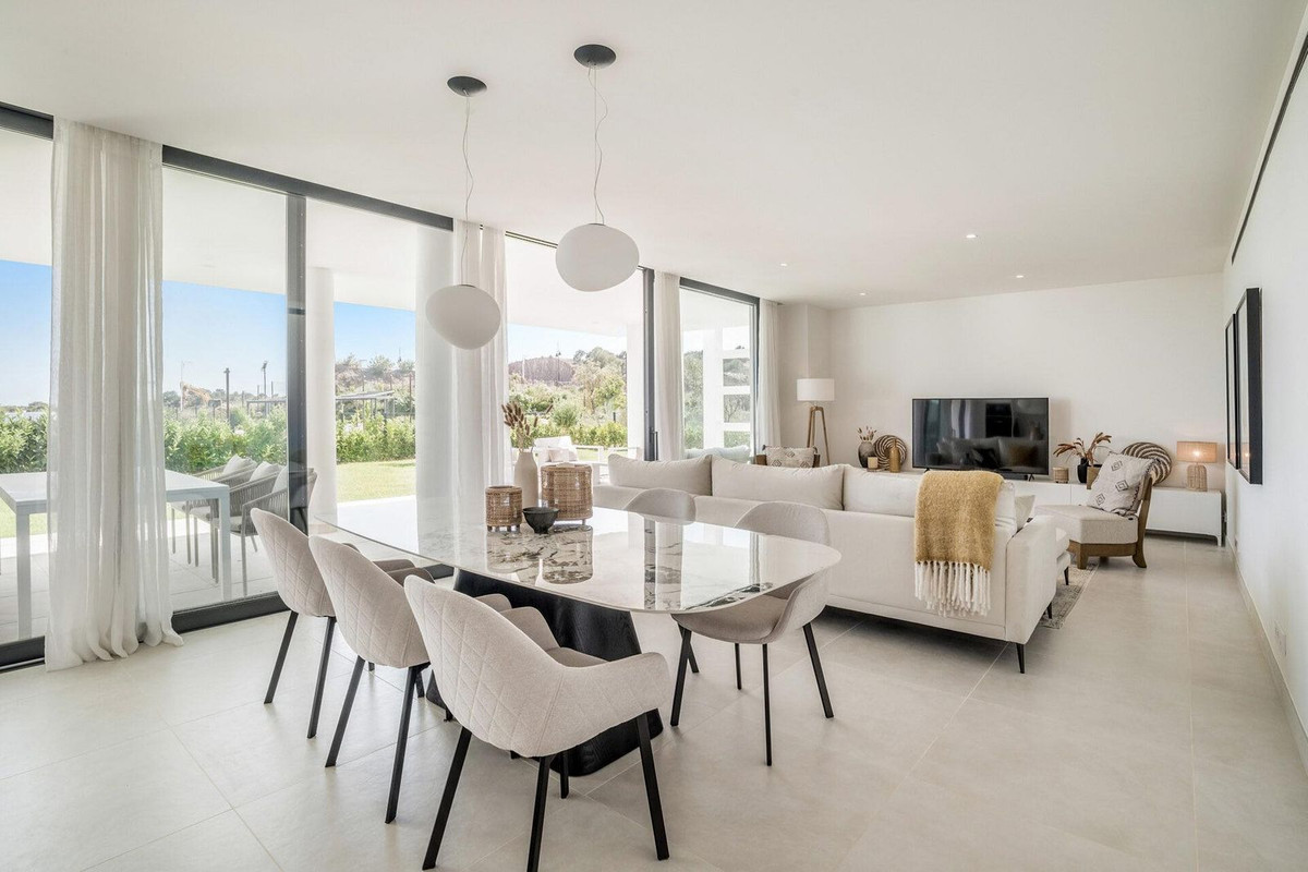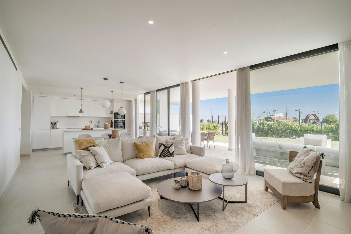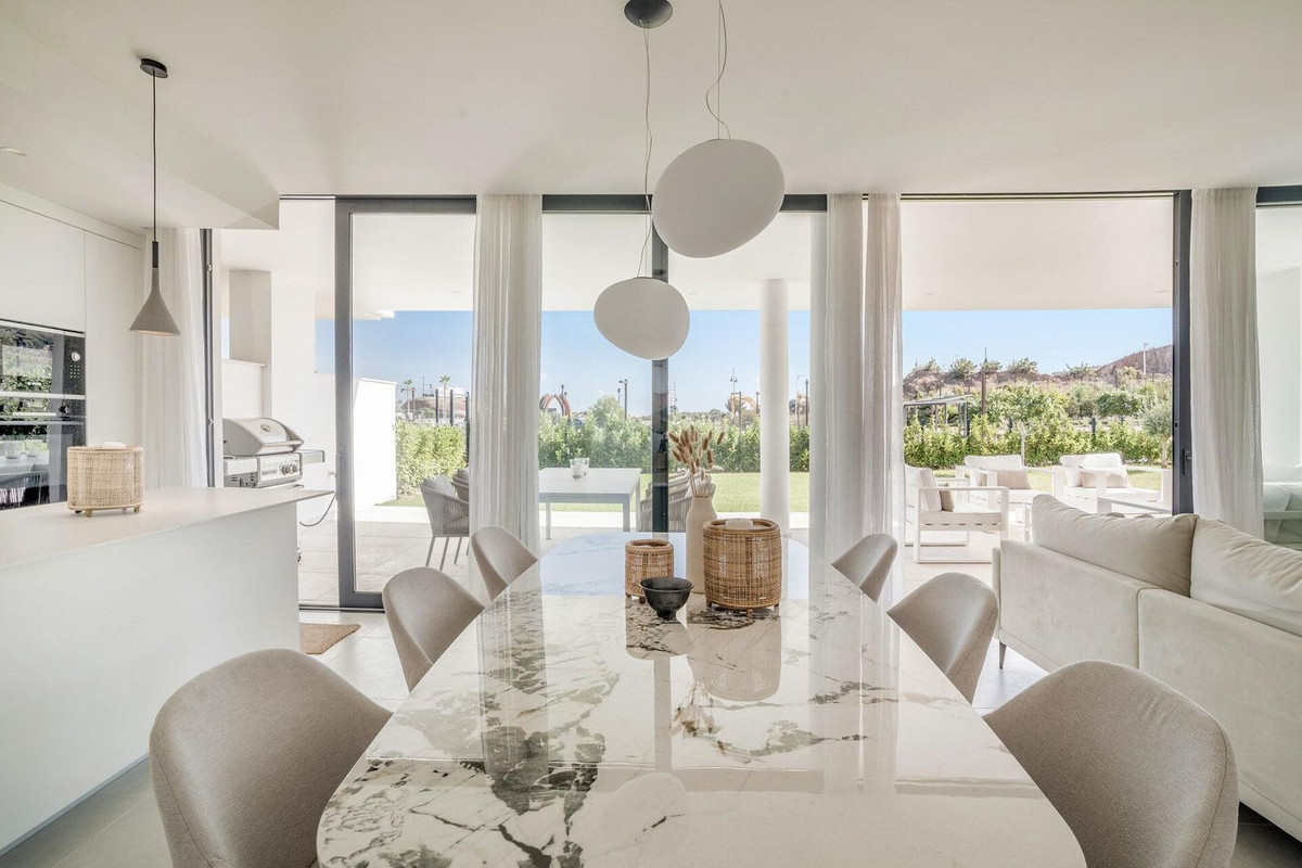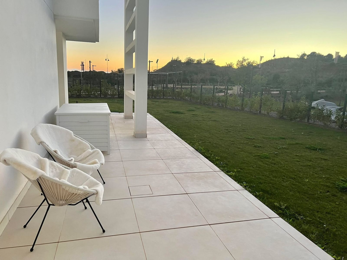 Stunning west facing corner garden apartment, with 3 bedrooms, and 2 bathrooms, spacious living-dining room, open plan kitchen fully furnished and equipped with electricial appliances from Bosch, including MIELE fridge/freezer, laundry area with washing machine/dryer, large wrap around terrace of 78m2 with access from living area and main bedroom. There is also a backside terrace of 34m2 with access from the secondary bedrooms. Spacious private garden area of 258m2. Main bedroom with ensuite bathroom and walk-in wardrobe. Air conditioning hot and cold, built-in wardrobes in secondary bedrooms and hall entrance, video intercom, domotic system, pre-installation alarm system, water purification system in kitchen, under floor heating throughout all the apartment including bathrooms. Includes two parking spaces (one parking with electric car charger) and one storage room.