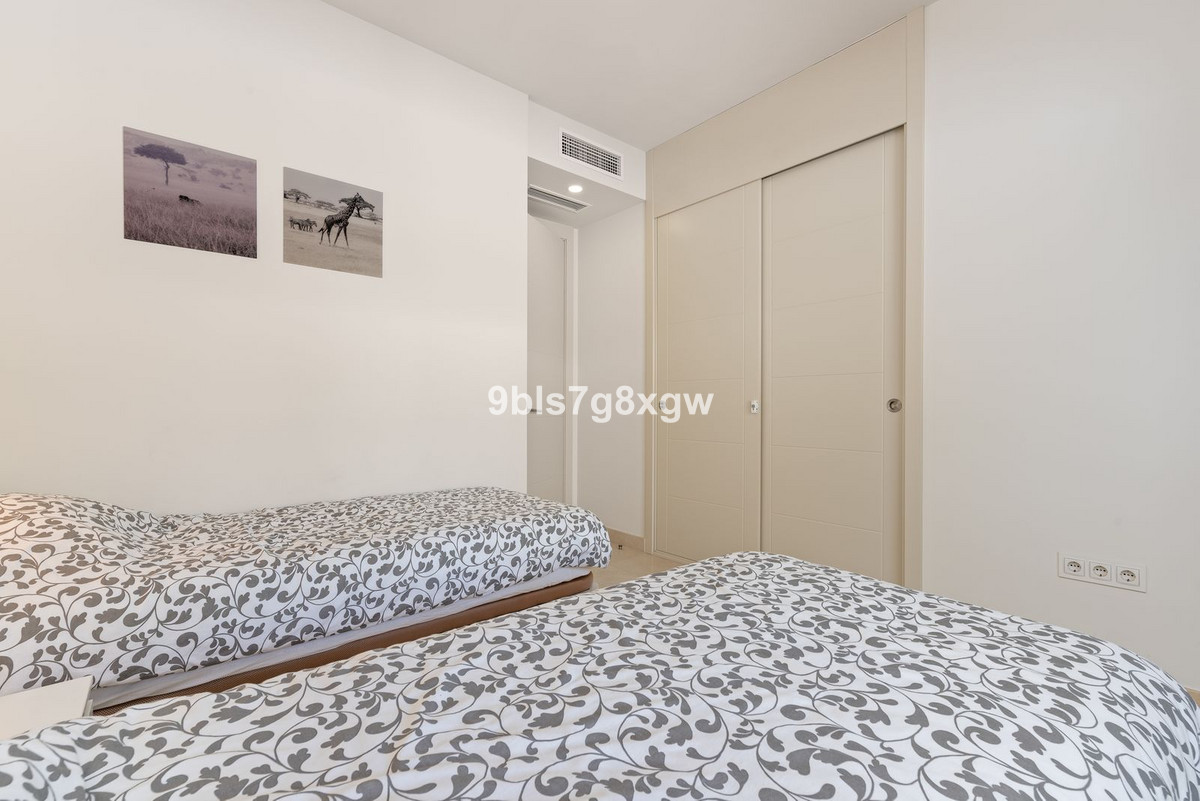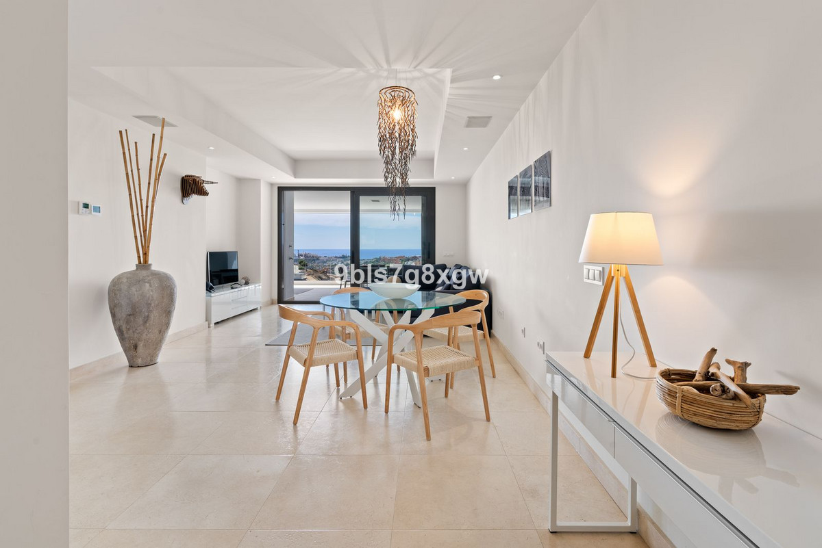 Located on the first floor, the property offers a bright and open living area with lounge, dining room and modern kitchen, combining aesthetics and functionality. The large floor-to-ceiling windows flood the interior with light, with the superb sea view as a backdrop. The master suite features large built-in wardrobes and a contemporary bathroom. The second double bedroom, equally well designed, has built-in wardrobes and is served by a family bathroom.