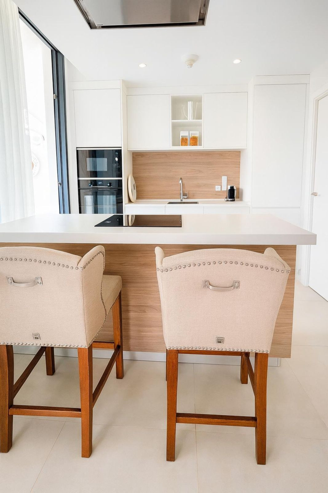 Det rymliga vardagsrummet och matsalen ansluter sömlöst till terrassen, vilket skapar en ljus och luftig atmosfär. Master-sviten har ett eget badrum och klädkammare, medan ytterligare två sovrum delar ett modernt familjebadrum. Ett fullt utrustat kök med premiumapparater kompletterar planlösningen, inklusive en modern bar med barstolar.