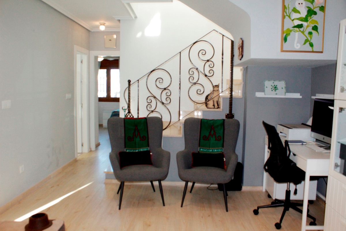 Vi är glada att kunna erbjuda till salu denna fantastiska 100m2 sydvästläge Bungalow Buhardilla i den mycket eftertraktade urbaniseringen av Pau-8 VILLAMARTIN. Fastigheten ligger i en gated urbanisering och erbjuder 3 sovrum, 2 badrum med 68m4 främre och bakre trädgårdar. Fastigheten går in genom 8m2 terrassen och fördelar sig som; rymligt vardagsrum med öppen planlösning, matplats med gasspis och ett öppet fullt utrustat kök, komplett med ett intilliggande verktyg / förvaringsutrymme. På denna nivå har du två dubbelrum med inbyggda garderober och ett badrum med badkar, ett av sovrummen har altandörrar som leder ut till den bakre 14m2 trädgården. På första våningen hittar du ytterligare ett dubbelrum med eget badrum med dusch, ett stort förråd och altandörrar som leder ut till det soliga 27m2 solariumet med härligt öppet grönområde och utsikt över poolen. Denna härliga fastighet säljs fullt "mycket smakfullt" möblerad och har luftkonditionering och internet. Denna underbara gated community är mycket väl underhållen och ger sinnesfrid. Det har 1 stora gemensamma pooler, gemensamma trädgårdar, parkering och gångavstånd till det kommersiella centrumet till den berömda Villamartin Plaza och golfbanan, snabbköpet och bara 1 km är det största köpcentret i Alicante-regionen, Zenia Boulevard, med över 150 butiker, barer och restauranger. De vita sandstränderna i Orihuela Costa ligger bara 3 km bort och 45 minuters bilresa från både Alicante och Murcia Corvera flygplatser.