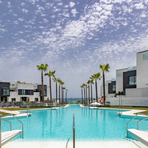 This is a fantastic property situated in Bermuda Beach, in an enviable front line beach position offering panoramic sea views. The property has been renovated to a high standard including a new kitchen and bathrooms in a modern contemporary style. The resulting effect is stunning and makes a perfect luxurious family home. The views can be appreciated from the moment you enter the property giving the "wow" factor. There is ample space on the terrace which leads off from the living room - enough for sun-beds as well as a large dining table and chairs. Upstairs are the bedrooms with the Master bedroom having an ensuite bathroom and its own spacious balcony with those incredible sea views and two further guest bedrooms sharing a bathroom. There is a private space for the car and there is a supermarket and restaurants within easy walking distance and it is only 10 minutes by car to arrive at the town of Estepona. A great value for money property in an unbeatable location. Short term rentals are permitted.