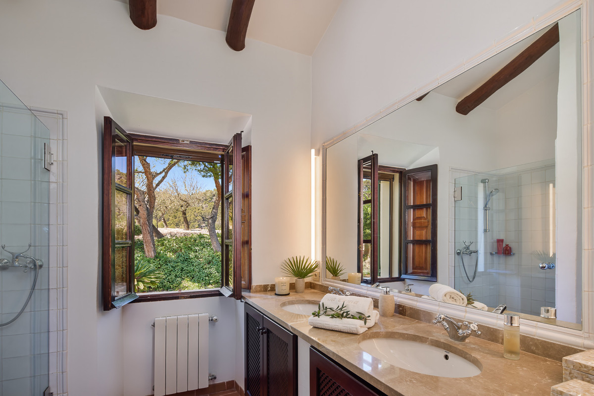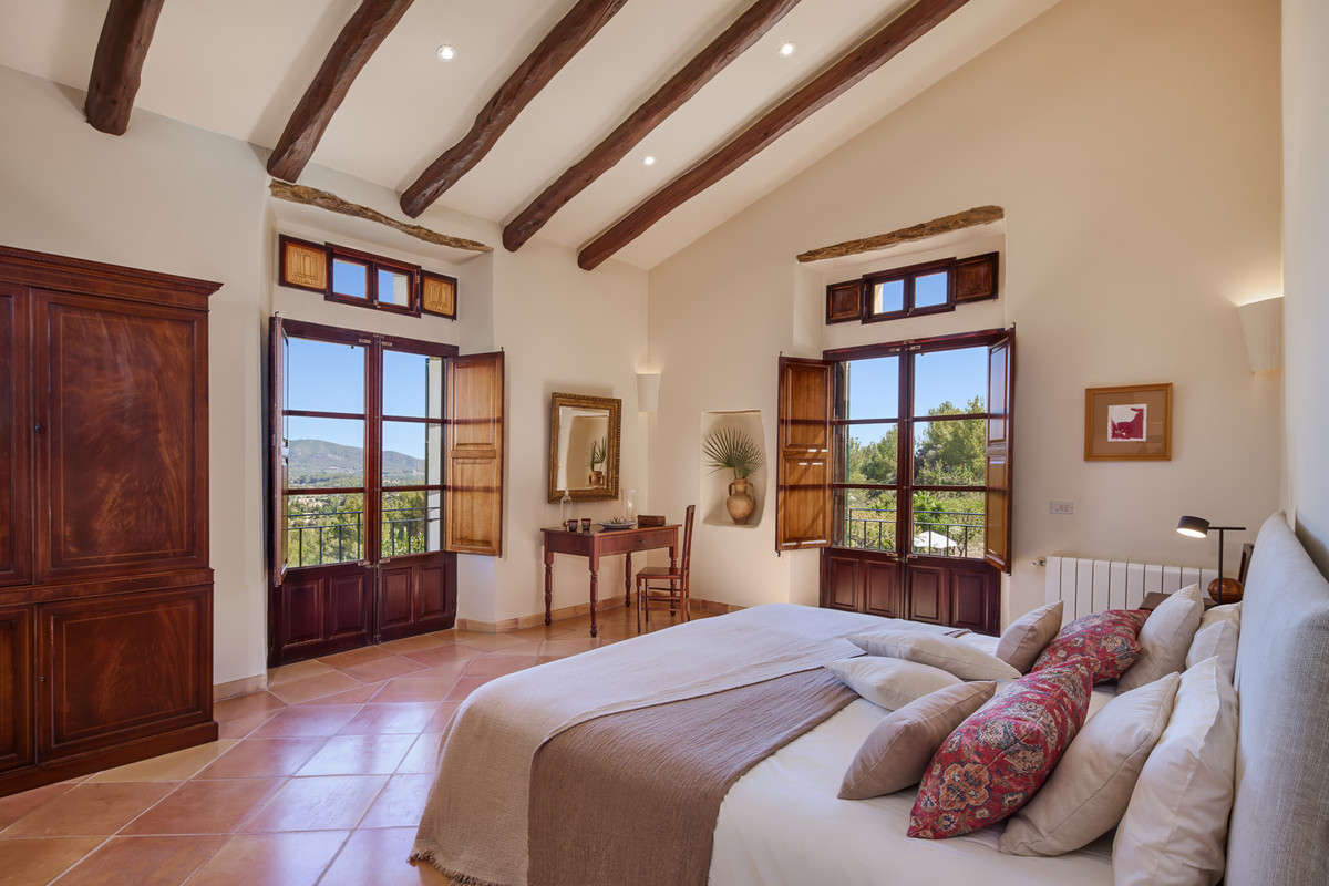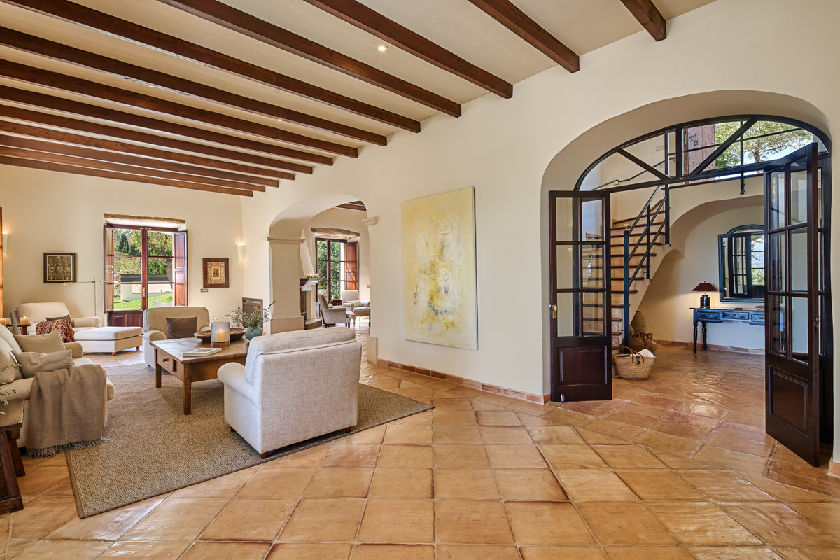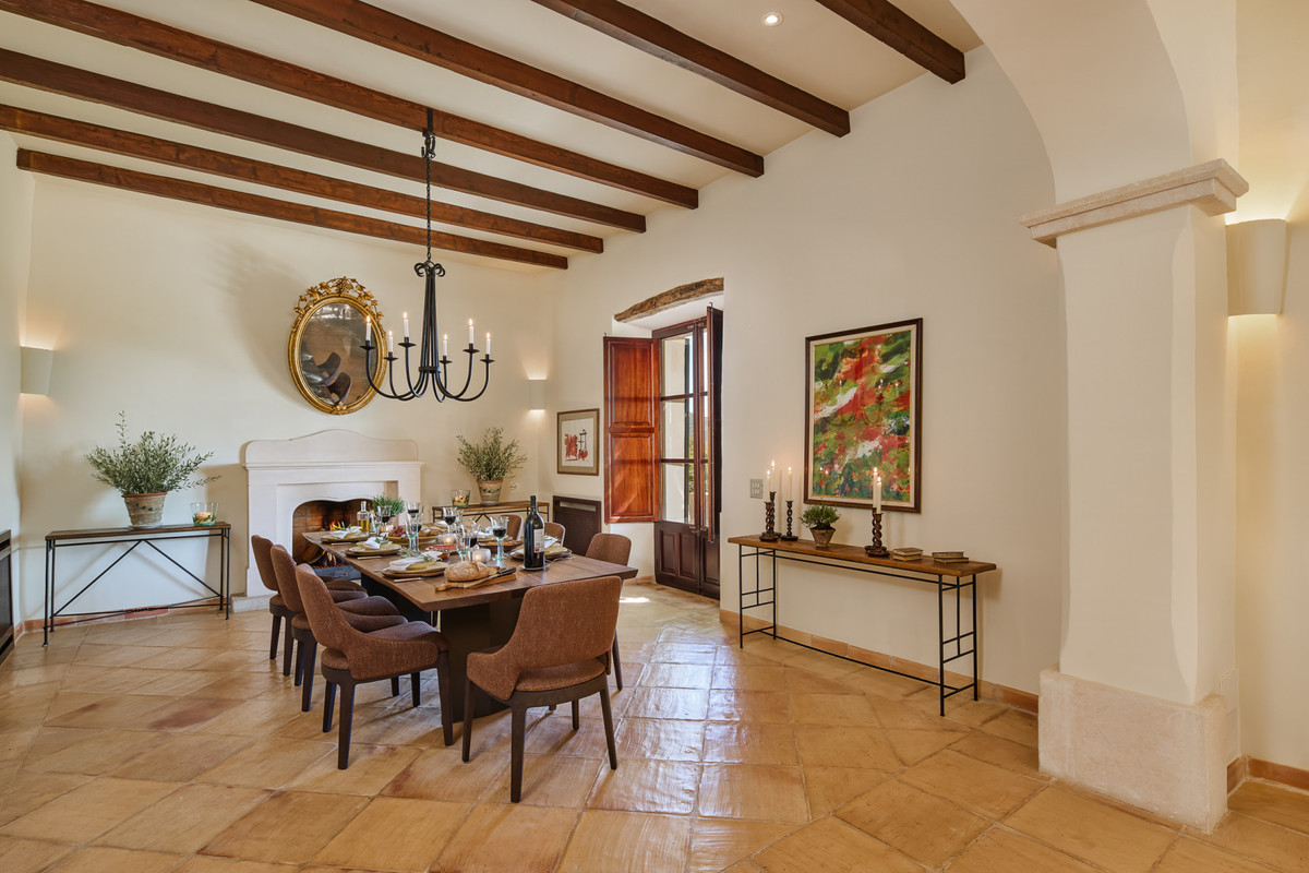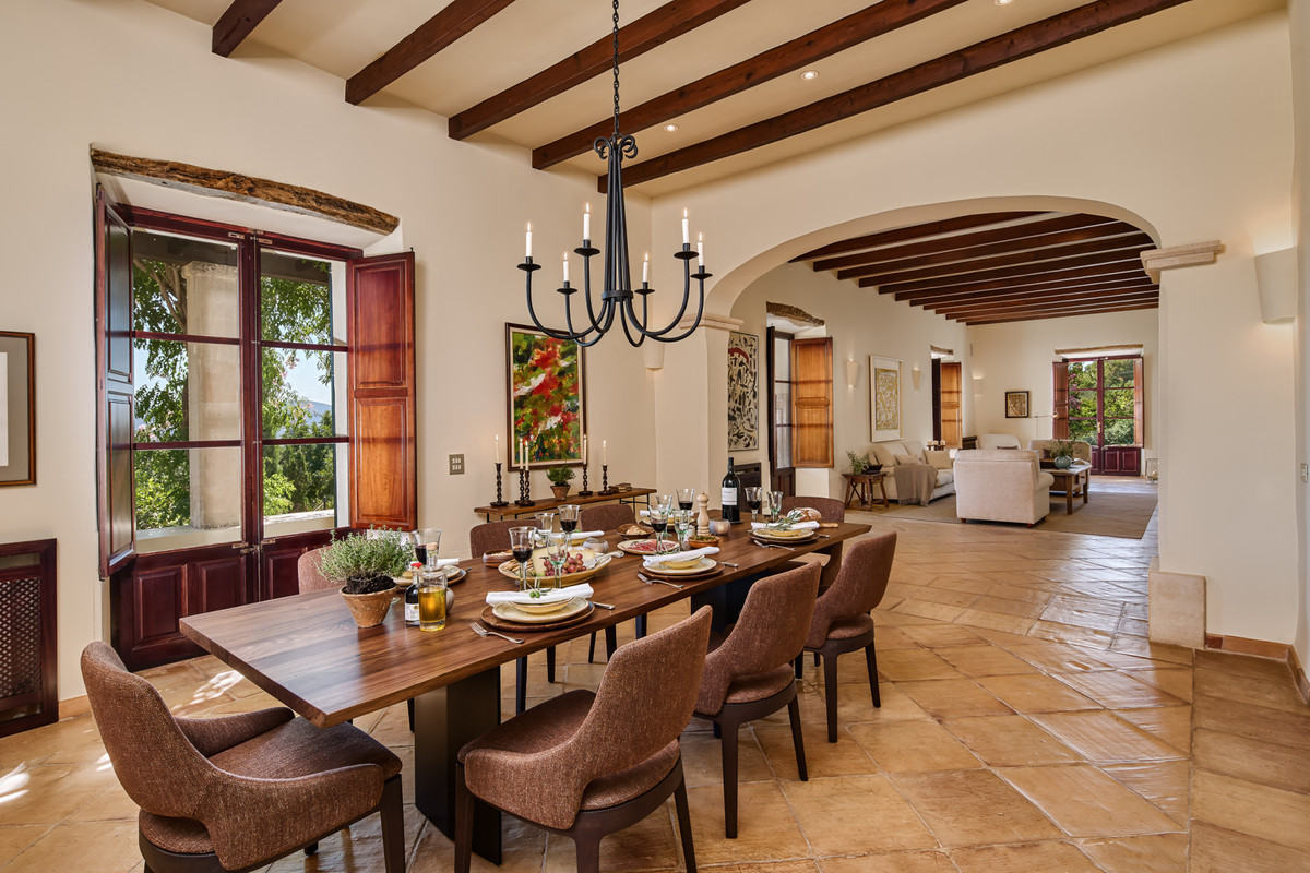 Boendet är generöst tilltaget med totalt åtta sovrum, varav sju har egna badrum. Ytterligare fem badrum och en gästtoalett säkerställer bekvämlighet för både boende och gäster. Arkitekturen är en hyllning till mallorkinsk tradition, med terrakottagolv, synliga träbjälkar och skräddarsydda hantverksdetaljer av en välrenommerad arkitekt.