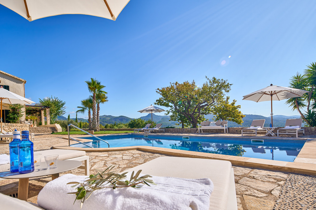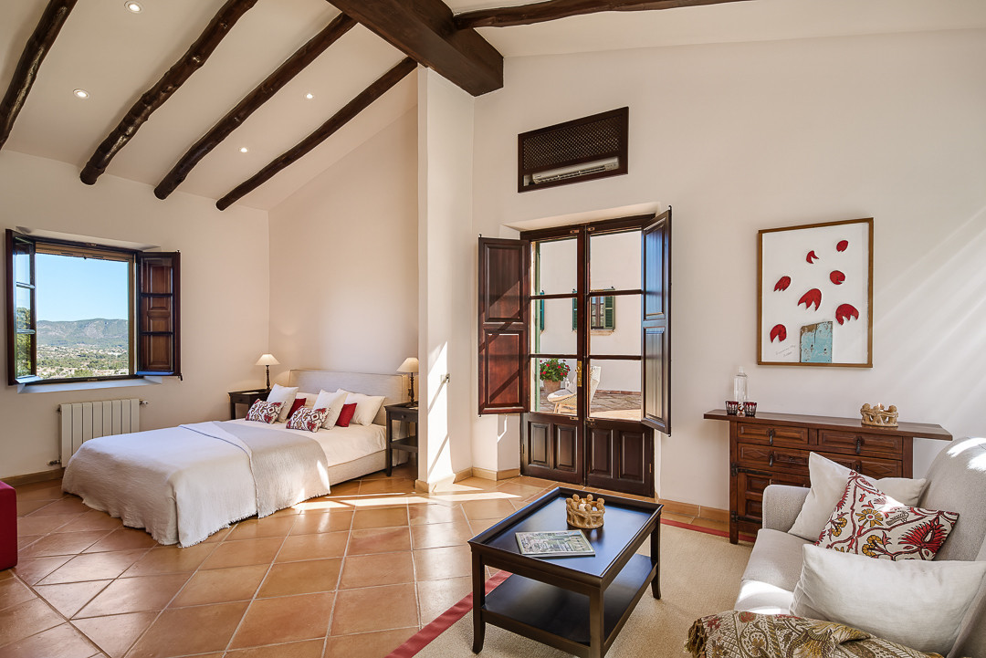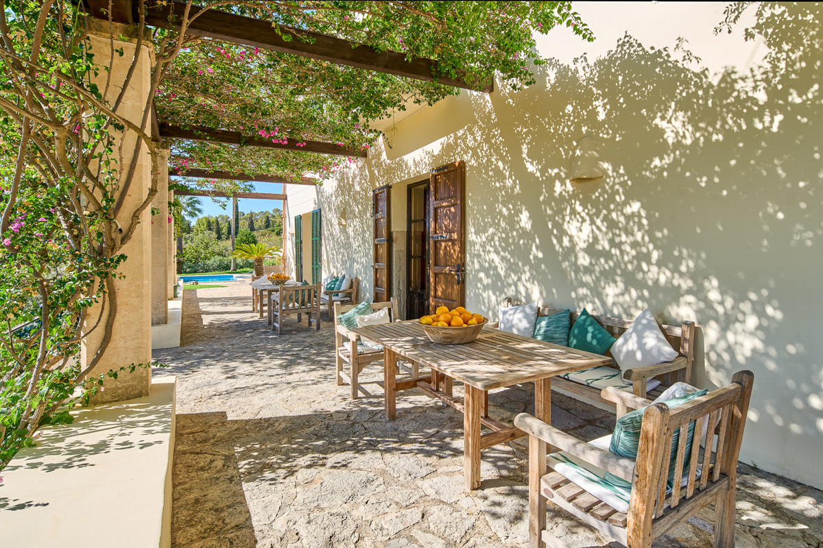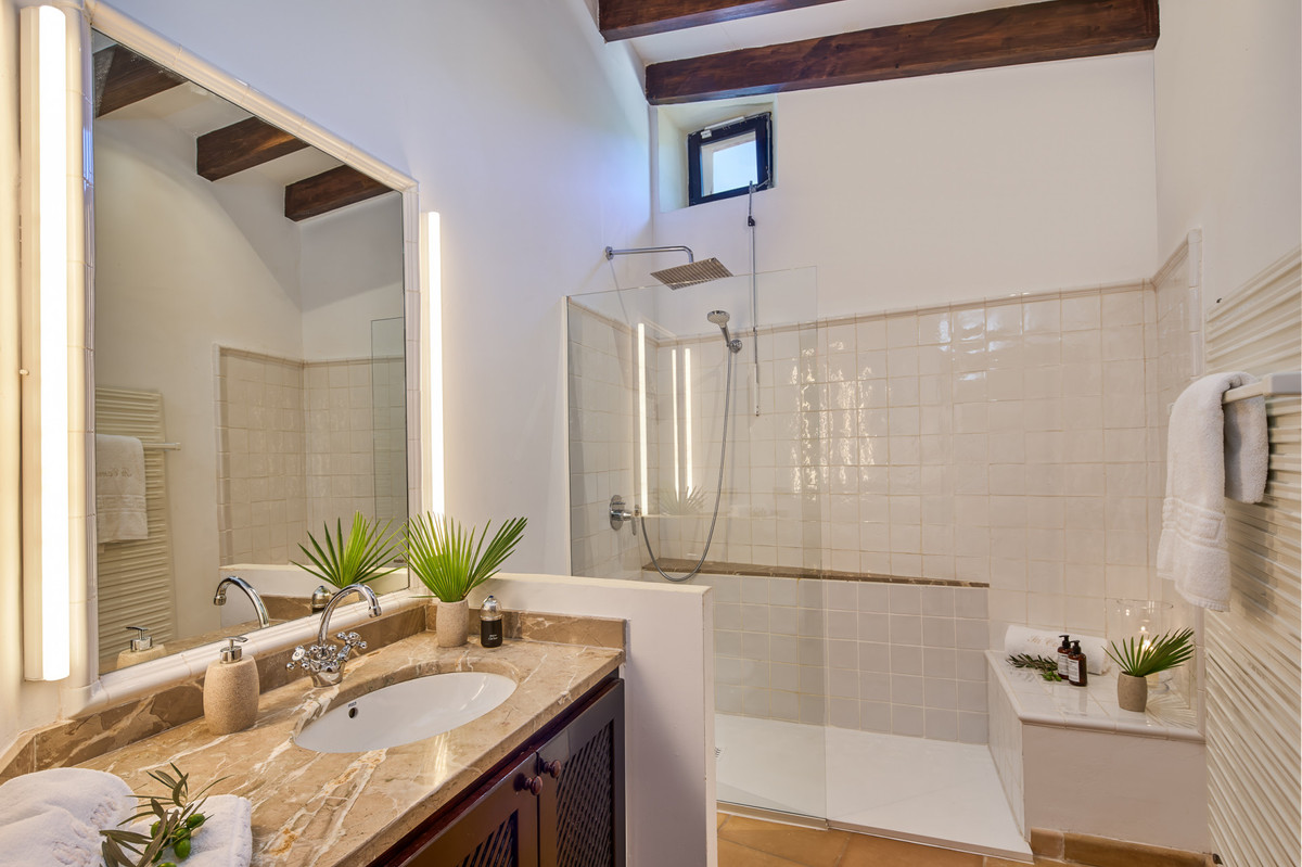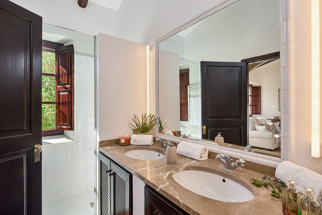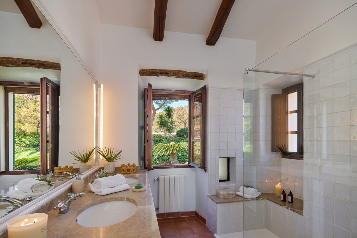 Boendet är generöst tilltaget med totalt åtta sovrum, varav sju har egna badrum. Ytterligare fem badrum och en gästtoalett säkerställer bekvämlighet för både boende och gäster. Arkitekturen är en hyllning till mallorkinsk tradition, med terrakottagolv, synliga träbjälkar och skräddarsydda hantverksdetaljer av en välrenommerad arkitekt.