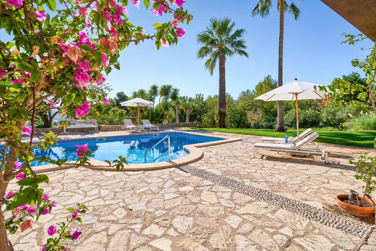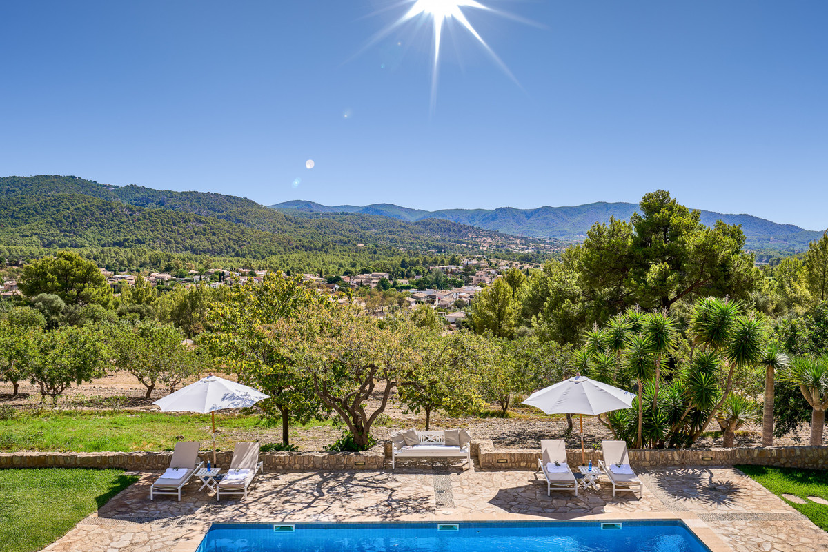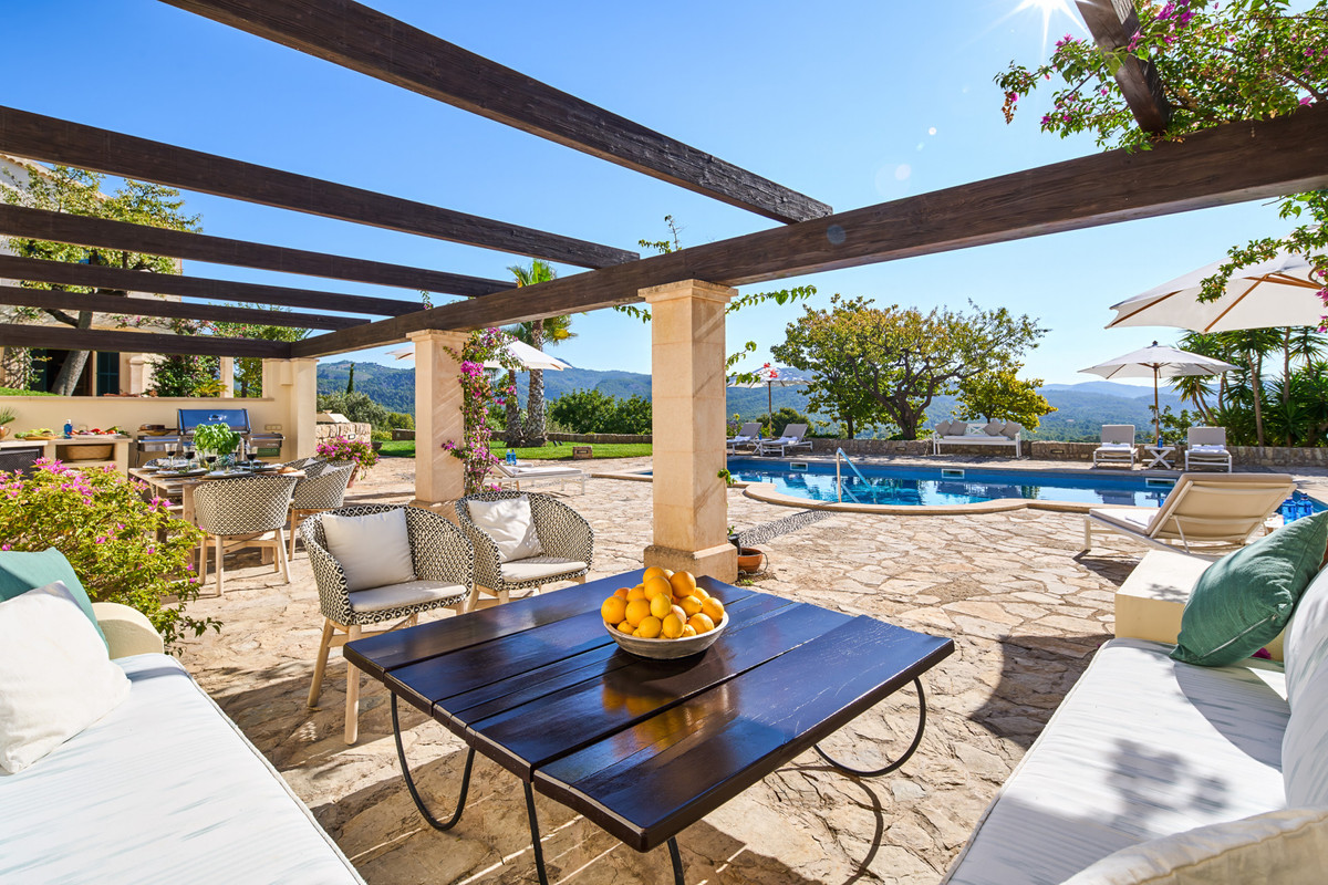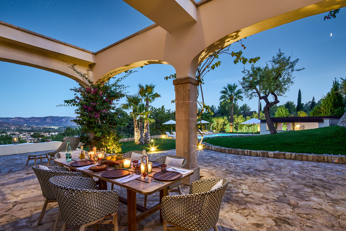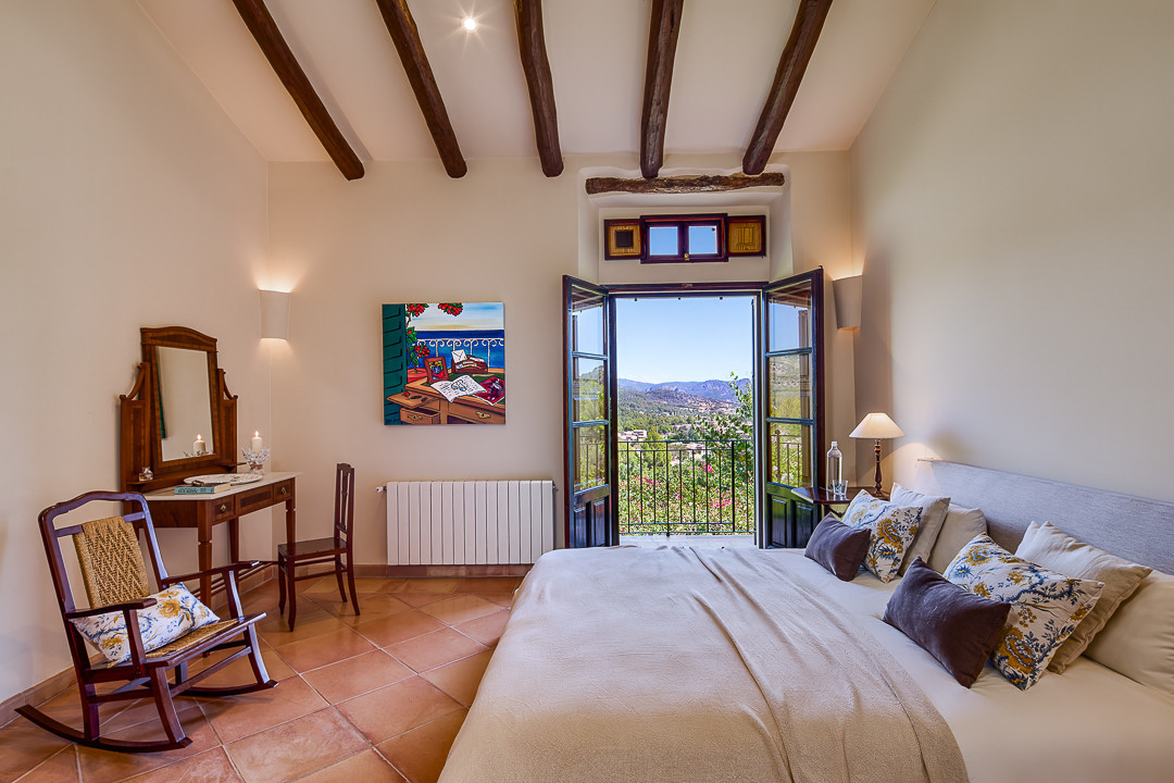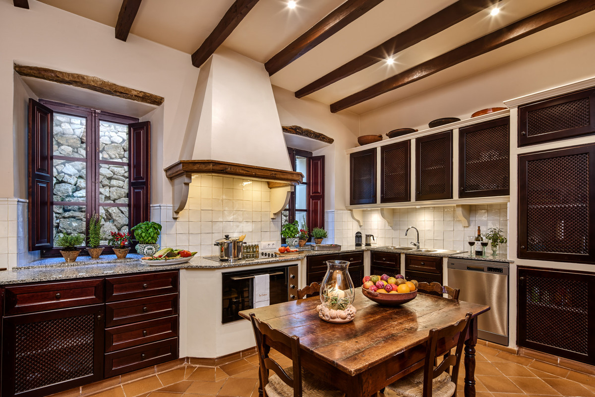 Boendet är generöst tilltaget med totalt åtta sovrum, varav sju har egna badrum. Ytterligare fem badrum och en gästtoalett säkerställer bekvämlighet för både boende och gäster. Arkitekturen är en hyllning till mallorkinsk tradition, med terrakottagolv, synliga träbjälkar och skräddarsydda hantverksdetaljer av en välrenommerad arkitekt.