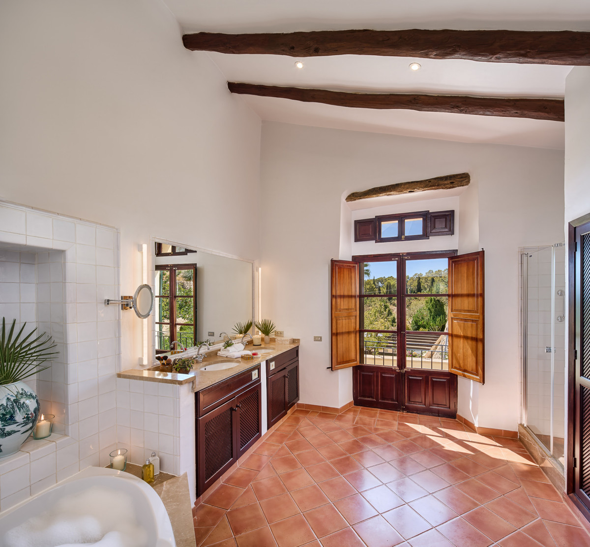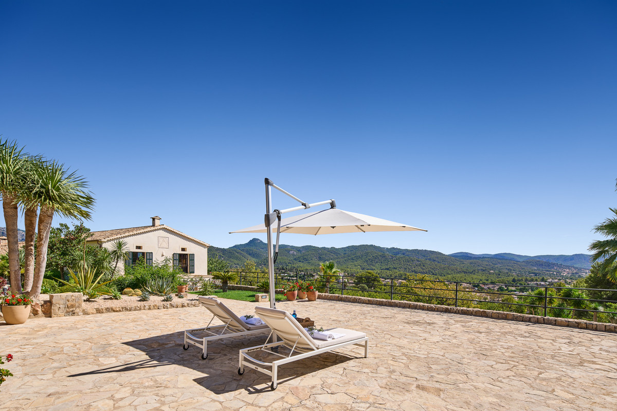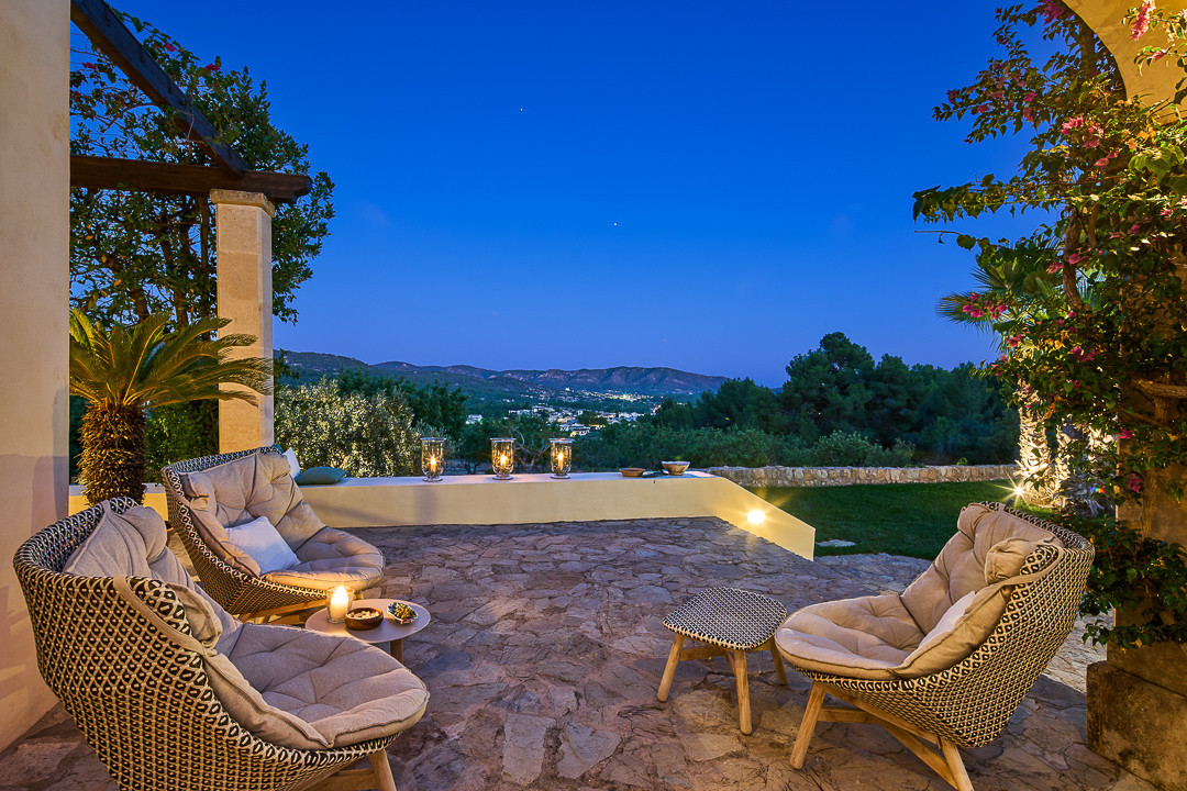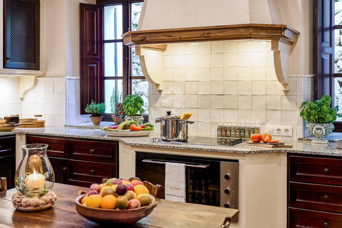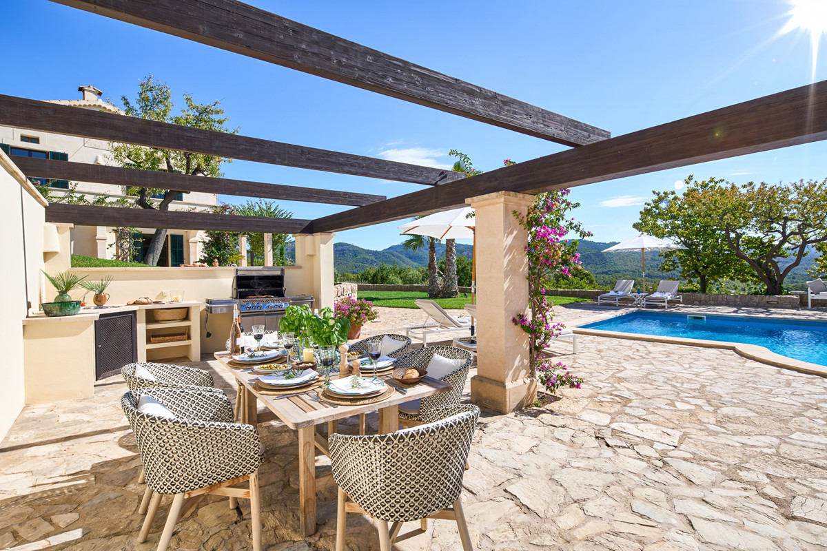 Boendet är generöst tilltaget med totalt åtta sovrum, varav sju har egna badrum. Ytterligare fem badrum och en gästtoalett säkerställer bekvämlighet för både boende och gäster. Arkitekturen är en hyllning till mallorkinsk tradition, med terrakottagolv, synliga träbjälkar och skräddarsydda hantverksdetaljer av en välrenommerad arkitekt.