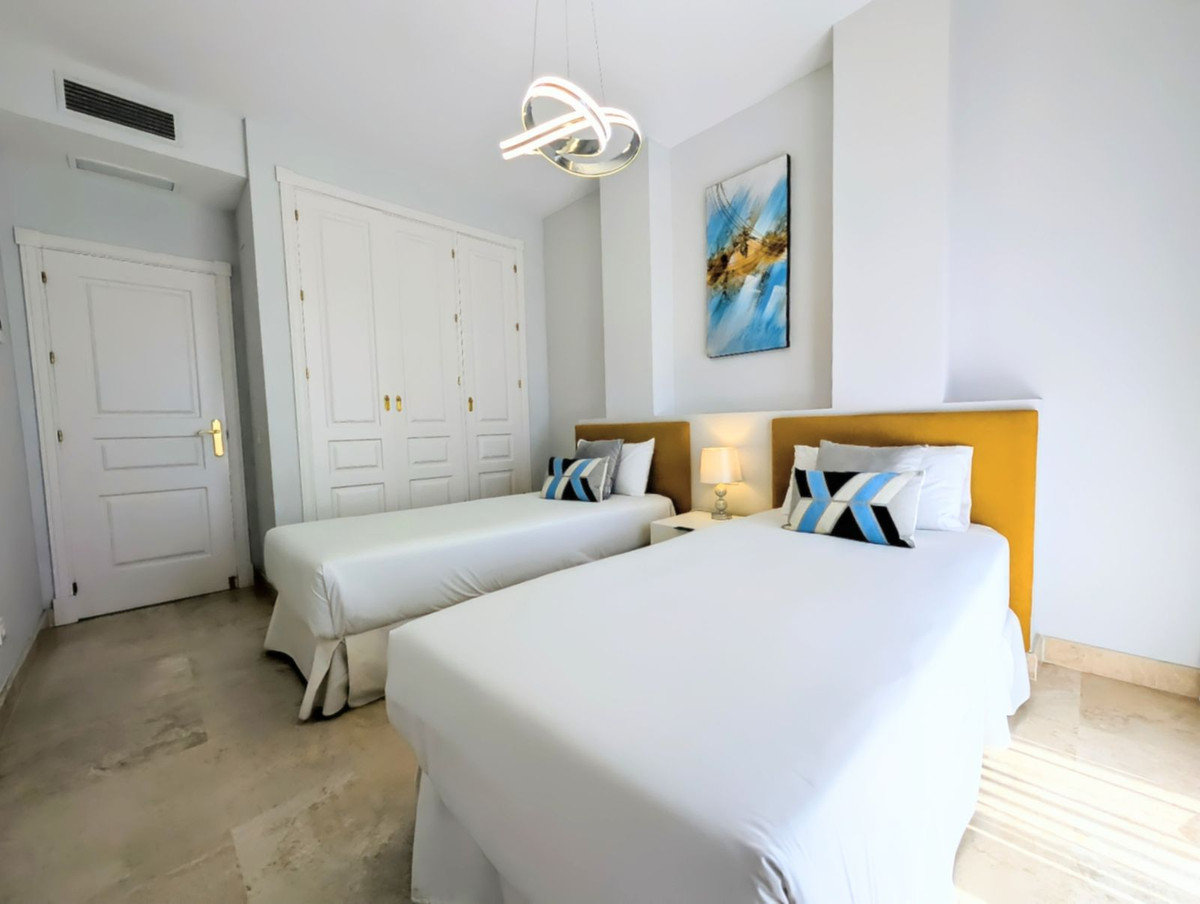Up the stairs there is a distribution hall leading to great size master bedroom with ensuite bathroom and two good size guest bedrooms sharing family bathroom. All the bedrooms have access to terraces, come with fitted wardrobes and independent thermostats for A/C.