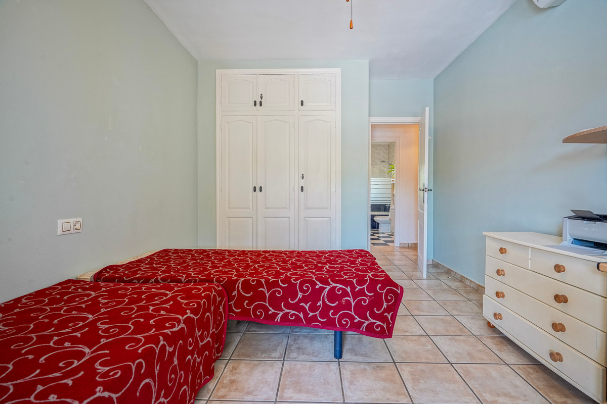 A few steps lead to the veranda at the front door and into an entrance hall. From the hall, you enter the spacious, open kitchen with an adjoining dining area. Next to the dining area is a living room with a fireplace. The eastern side of the villa features a master bedroom with an en-suite bathroom and two bedrooms with a shared bathroom. All bedrooms have built-in wardrobes, shutters and air conditioning. The villa features underfloor heating and a fireplace to guarantee maximum confort all year round. Besides the villa has a laundry room located in between the kitchen and the hallway. Outside, there is a spacious covered terrace on both the south and west side of the villa. There is also a large swimming pool with an outdoor kitchen and an outdoor bathroom. Ideal to spend long summer evenings outdoors. The villa is surrounded by a mature Mediterranean garden and has several parking spaces, a carport and a storage room.
