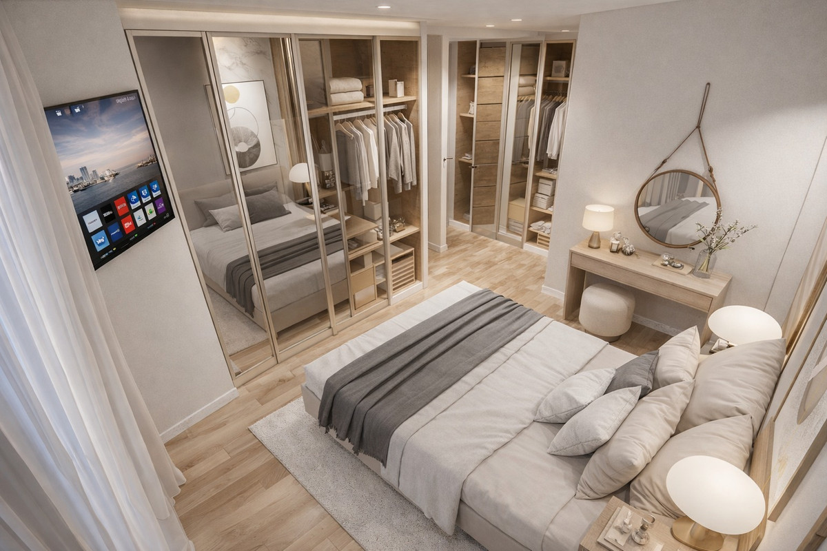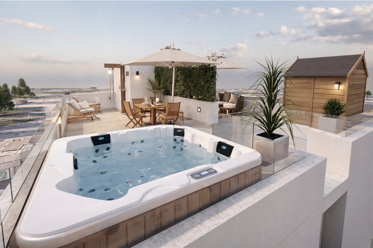 Penthousen erbjuder rymliga privata solterrasser, perfekta för solbad, avkoppling eller sociala sammankomster under den mediterrana himlen. Den moderna designen och de exklusiva materialen skapar en elegant och välkomnande atmosfär i varje detalj.