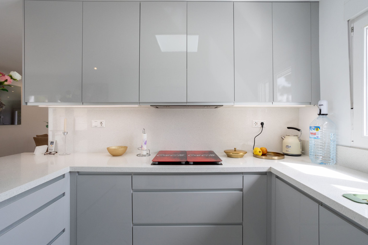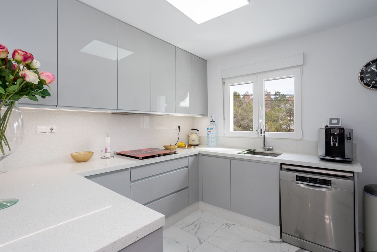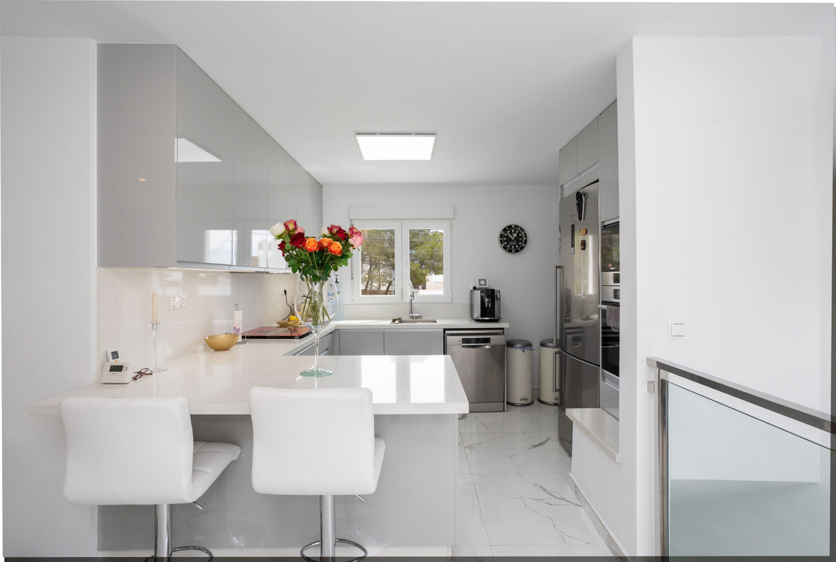 Köket är modernt och har bra förvaringsmöjligheter och goda arbetsytor.