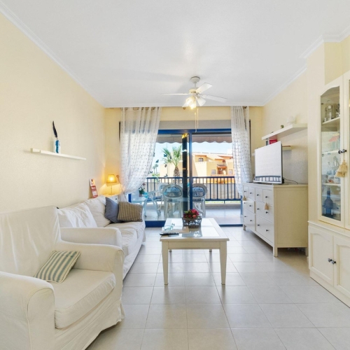 Fantastic apartment with panoramic sea views on the first line. Second floor, south facing. 91m2, three bedrooms, two complete bathrooms (one en suite), an independent equipped kitchen, living-dining room and 15m2 of the terrace. A/C in the living room. Sold partially furnished. The residential complex with a swimming pool is located just above the Aguamarina and Campoamor beaches, with direct private access to the beach. The apartment has parking place and storage.
