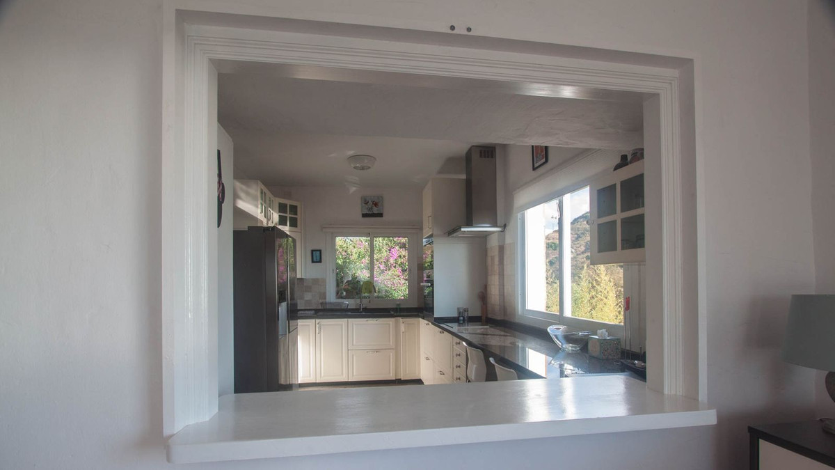 • Bright and spacious living room with fireplace, large windows, and sliding glass doors that open onto a covered porch with direct access to the pool and gardens – ideal for enjoying the sea views all year round.