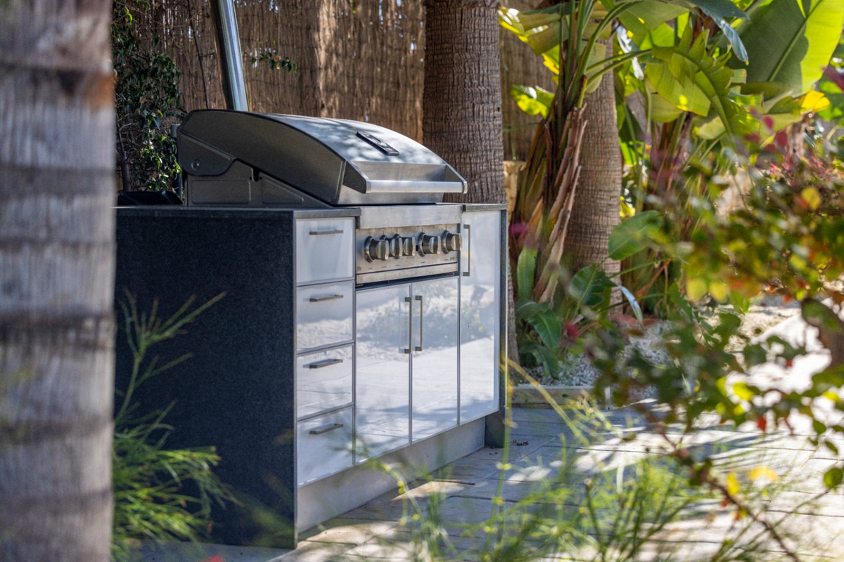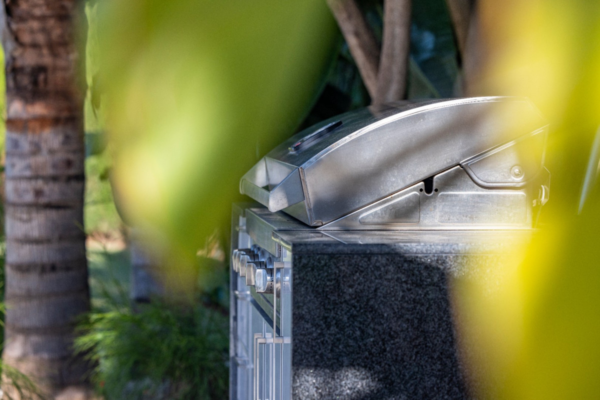 Trädgården inkluderar ett privat underhållningsområde med grill, omgiven av anlagda grönområden som säkerställer integritet.