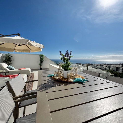 Fantastisk taklägenhet där alla rummen har havsutsikt utan insyn och skjutdörrar ut till den enorma terrassen om drygt 60 kvm mot sydväst. Terrassen bjuder på en enorm panoramautsikt mot havet, man ser även kustlinjen, delar av Benalmadena, Fuengirola med omnejd samt bergen runt om. Utsikten är bäst på Costa del Sol! Ni kan sluta leta vidare.
