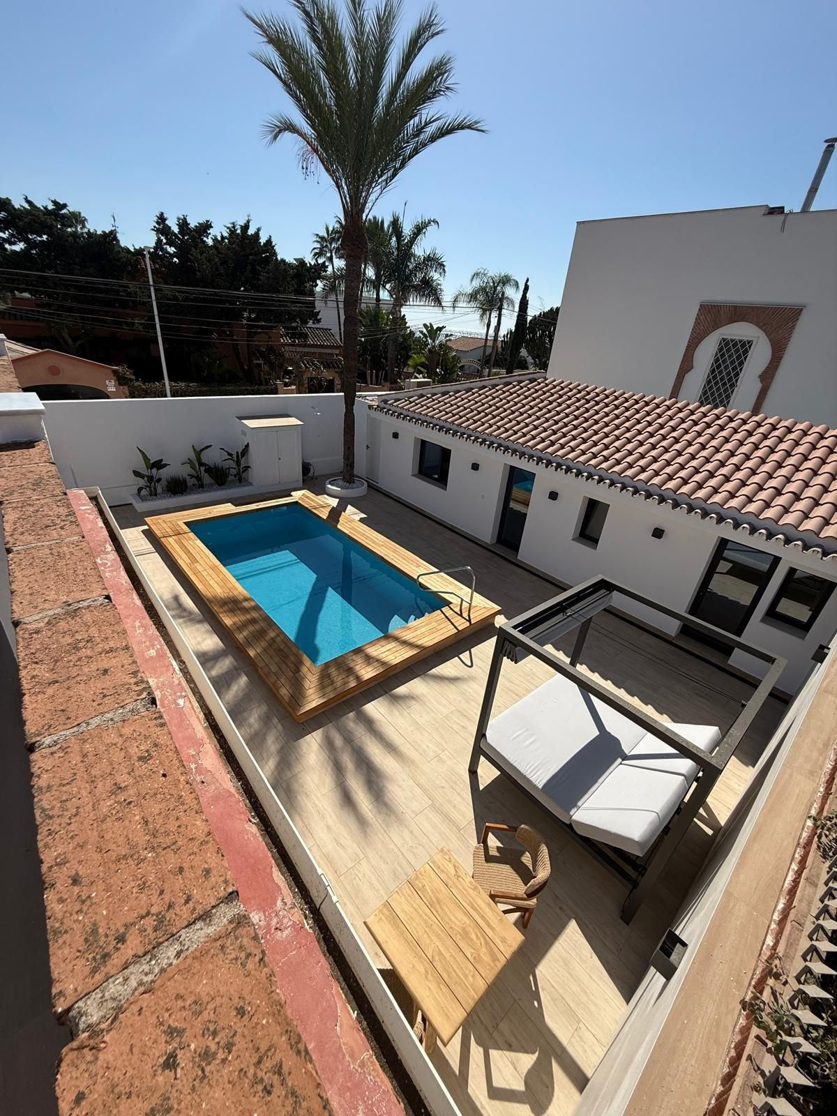 Outside, the property boasts a fully renovated heated swimming pool, ideal for year-round enjoyment. There is also a barbecue area and a chill-out space with a Balinese bed — perfect for relaxing and enjoying the Mediterranean climate.