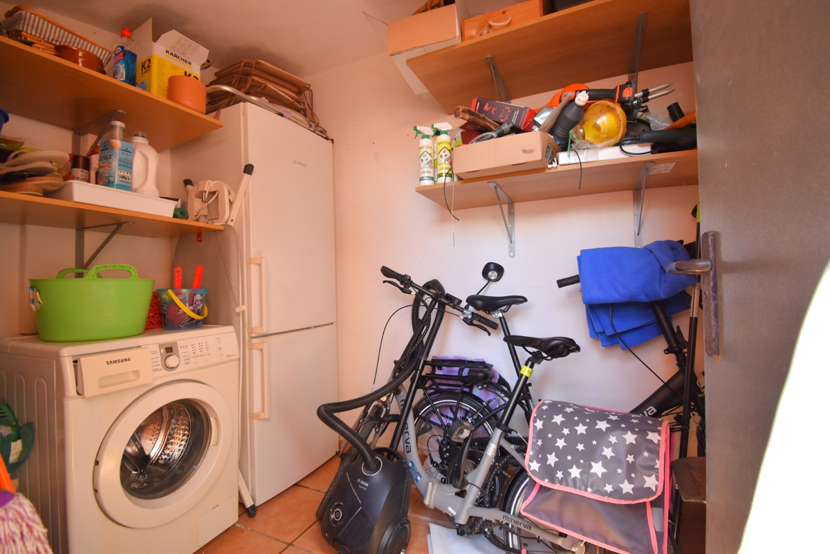 This South West Facing, Three Bedroom, Detached Villa in Playa Flamenca is located in Orihuela Costa, just a short 7 minute walk to a variety of amenities, including a great choice of eating places and café bars. The popular La Zenia Boulevard shopping centre is 10 minutes away, while the beach and a main chain supermarket can be reached in just 3 minutes by car. Several golf courses are also within a 10 minute drive. The property comprises a covered entrance terrace leading into an L-shaped lounge/dining room with feature fireplace and gas fire; a separate, well-fitted kitchen with door out leading outside; a ground floor double bedroom; and a family shower room. On the first floor there are a further two double bedrooms, the master benefiting from access to a private terrace, plus internal stairs leading up to the solarium with views across to the communal pool. Outside, the tiled 100m² garden includes a driveway for off-road parking, a storage room, and a covered area ideal for shaded al fresco dining. All bedrooms have built-in wardrobes with two of them benefitting also from ceiling fans, there is also air conditioning throughout.  A charming family or holiday home in a highly sought-after location of the Costa Blanca South.\n