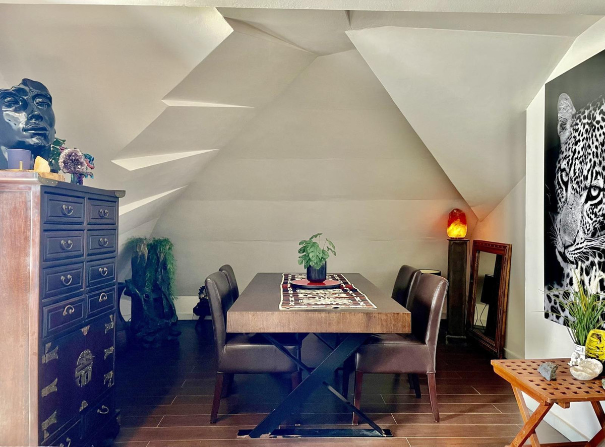 Lägenheten nås via en privat ingångshallen, med trappor som leder till ett ljust och rymligt huvudgolv. Den öppna planen levande och matplats är utformad i en modern loftstil, med höga tak och stora fönster som översvämmar utrymmet med naturligt ljus. Ett fullt utrustat kök kompletterar vardagsrummet, vilket skapar ett sömlöst flöde för vardag och underhållning.