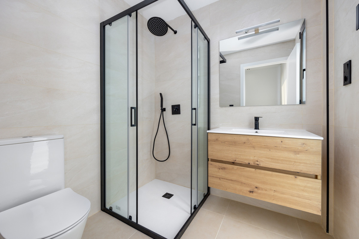Badrummen har resin duschar, glasväggar, svarta inbyggda duscharmaturer, hängande porslinslavabos med skåp, speglar och svarta enhetliga blandningskranar.