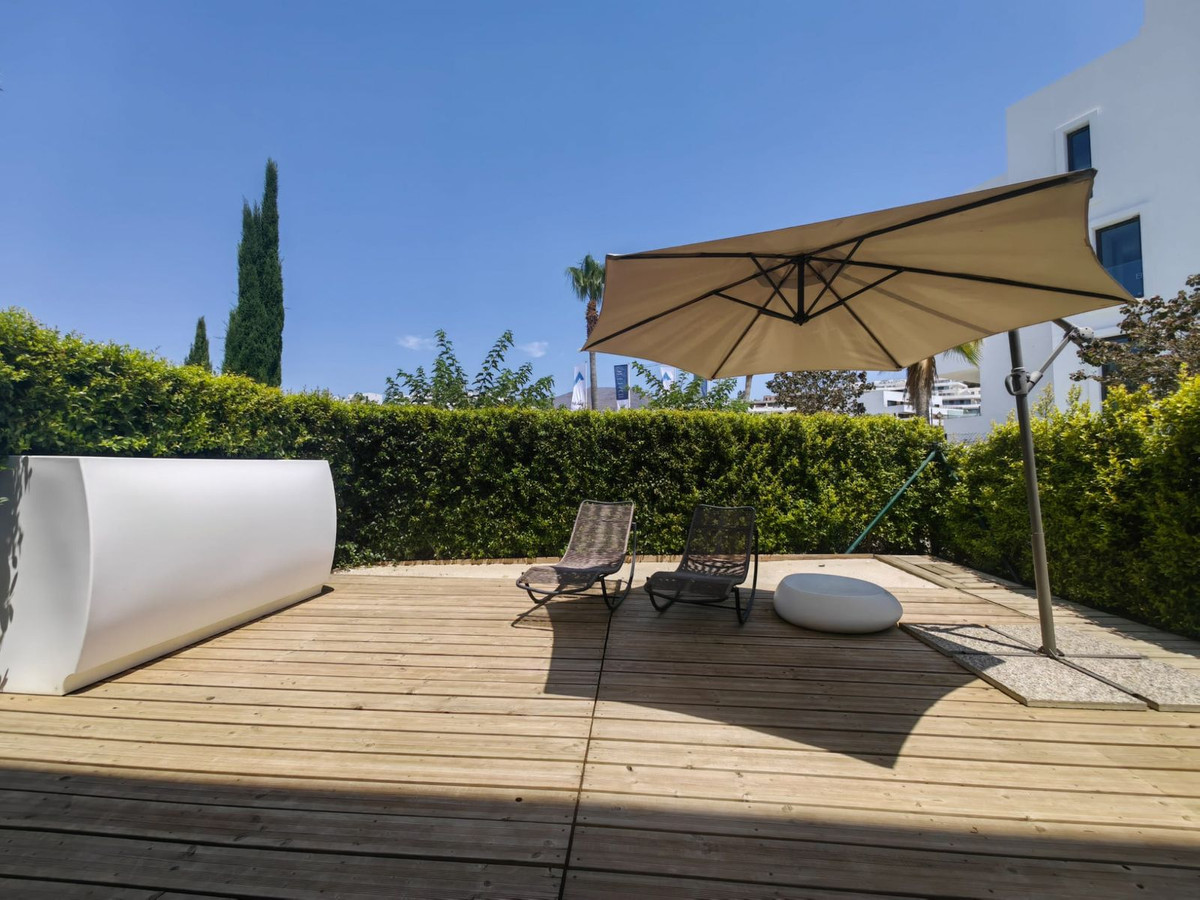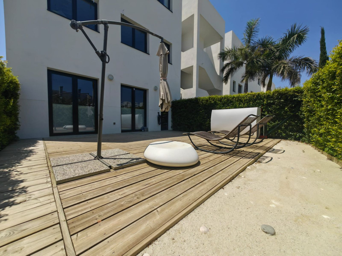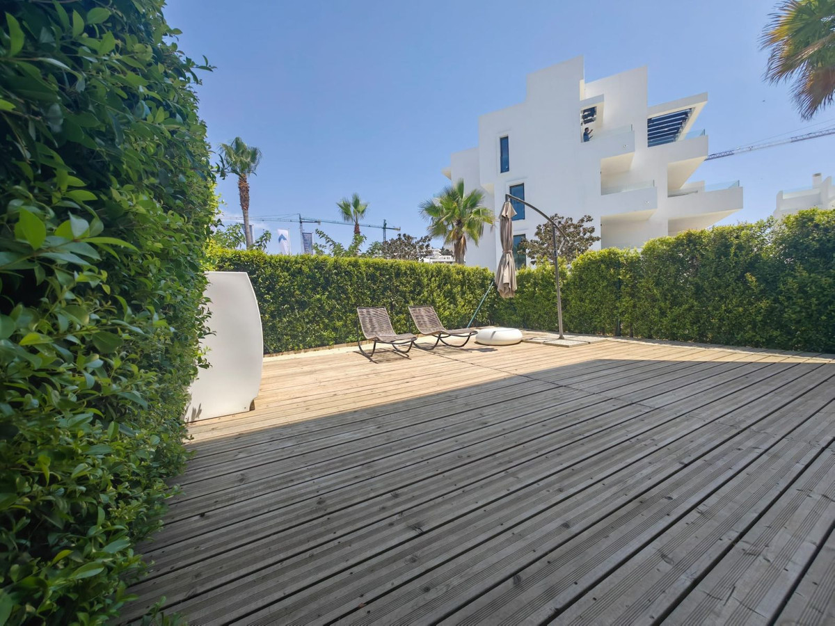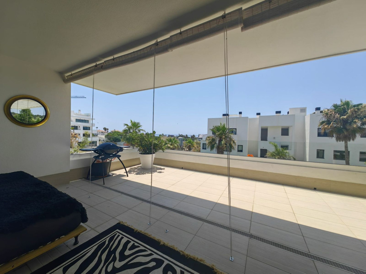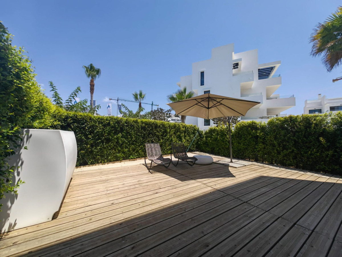 The bright and open-plan living area extends effortlessly onto a large, semi-covered south-facing terrace with partial sea views, creating the perfect setting for enjoying the Costa del Sol's sunshine all day long. At the rear, a private garden with wooden decking provides a tranquil outdoor retreat, ideal for al fresco dining, barbecues, or simply unwinding.