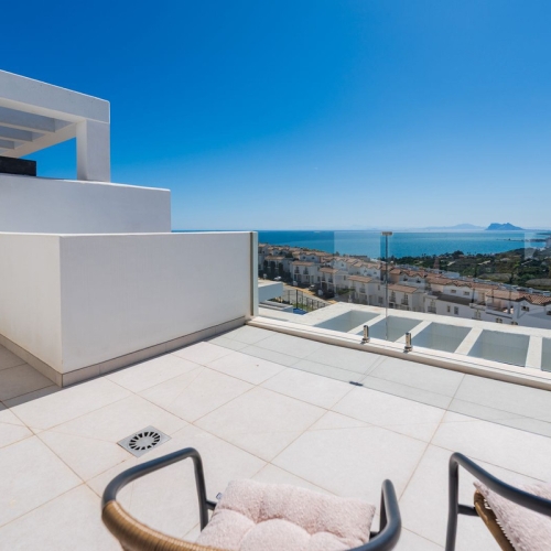 Townhouse in Bahia de Las Rocas, two minutes from Sotogrande, with two bedrooms with two en suite bathrooms (one with Jacuzzi) and a guest toilet. Spacious living room with access to the terrace overlooking the sea, Gibraltar and African coast. This townhouse has three floors and a basement that can be converted into a bedroom, game room, etc. ground floor with living room, fully equipped kitchen and guest bathroom, first floor with two bedrooms and access to a large solarium with stunning views. The property has fitted wardrobes, hot / cold air conditioning and carport. The urbanization is gated and has beautiful gardens and pools for adults and children.