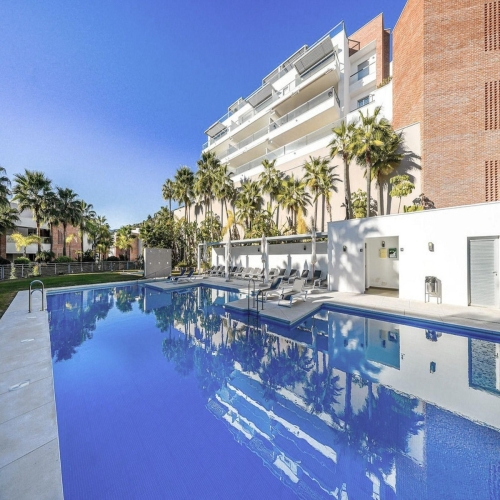 Elegant 2-bedroom, 2-bathroom apartment (one of them en-suite) for sale, located on an elevated ground floor within a gated residential complex with communal pool and gardens, in the prestigious area of Los Arqueros, Benahavís.