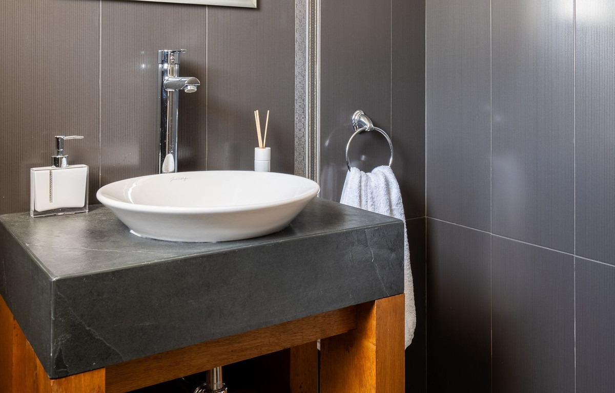 On the lower level, the elegant master suite features a generous walk-in wardrobe and a luxurious bathroom with both bathtub and shower. A section of the adjoining patio has been enclosed to create a practical home office — perfect for remote working. The bedroom opens directly onto a private terrace and garden, with access to the beautifully landscaped communal areas and swimming pool.