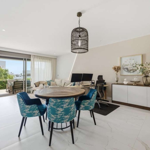 This elegant 2 bedroom, 2 bathroom apartment is situated in the highly desirable frontline beach community of Mar Azul, located on the prestigious New Golden Mile. The property provides direct access to the sand and sea. It is within walking distance of Estepona's lively town centre, offering a wealth of bars, restaurants, shops, and all essential amenities. Its prime location ensures excellent transport links and proximity to schools, golf courses, and Estepona Marina, making it ideal for both permanent residence and holiday retreats.