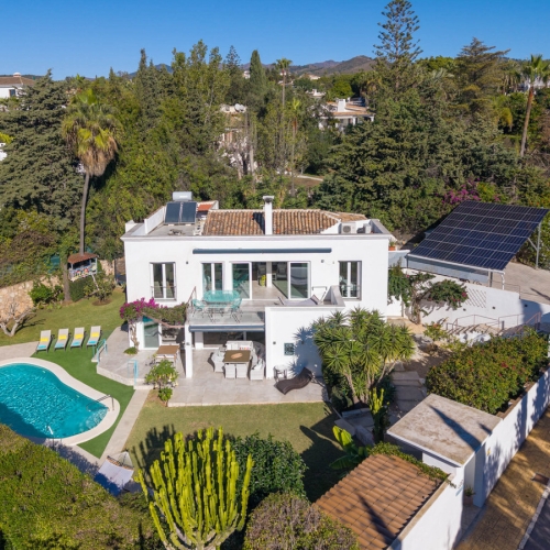 Fantastisk villa i modern stil som ligger inom kort avstånd till en av de bästa stränderna i Marbella. Beläget i slutet av en återvändsgränd i ett mycket lugnt och familjevänligt område med andra stora villor, bara 6 km från Marbellas centrum. Marbella Golf & Country Club och Santa Clara Golf ligger bara en kort bilresa bort. Denna vackra fastighet i västerläge har byggts med material av hög kvalitet.