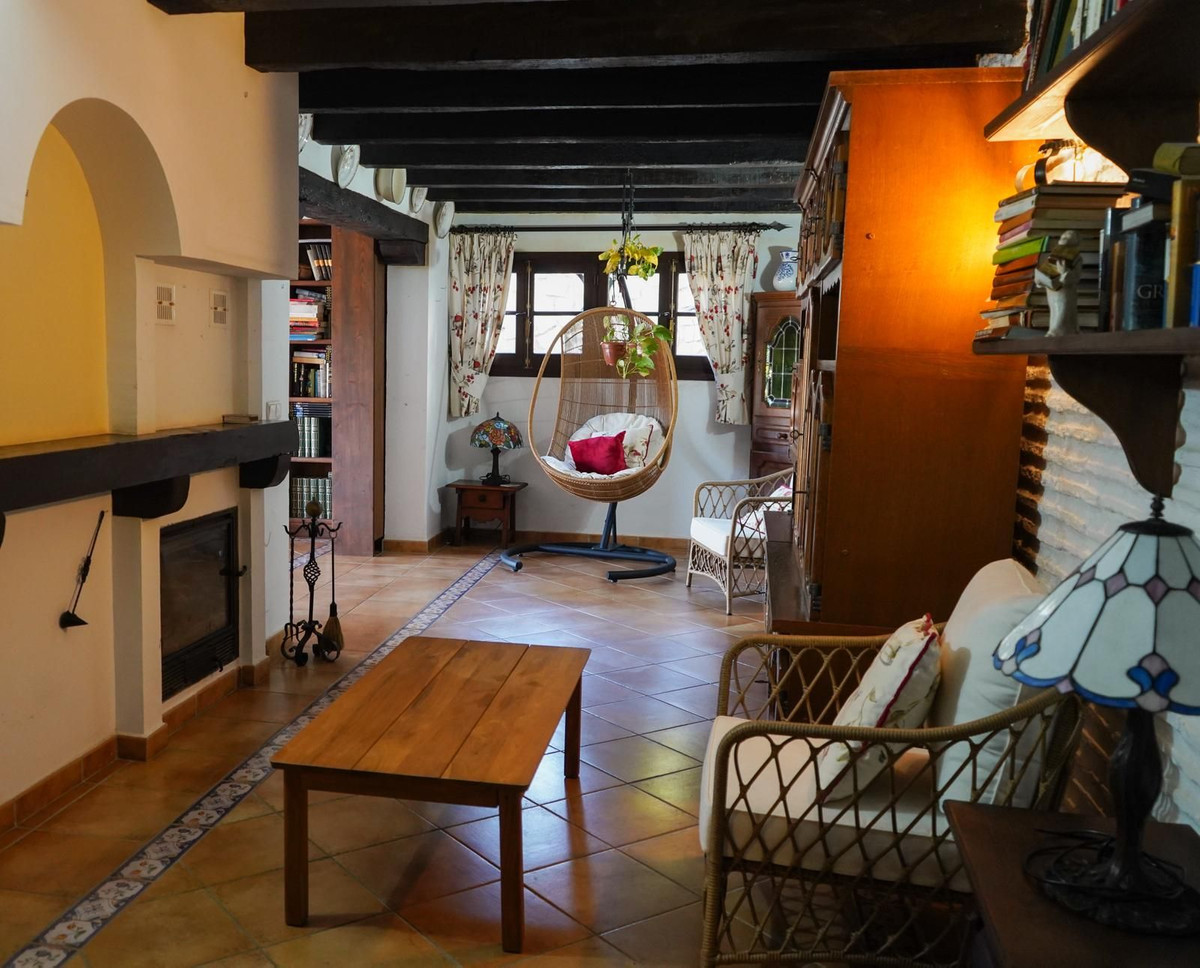 Inside, the villa showcases classic Spanish craftsmanship, with exposed wooden beams, intricate detailing, and a grand living room with vaulted ceilings and a cozy fireplace. Large windows and multiple terraces fill the home with natural light, creating a seamless connection between indoor and outdoor spaces.