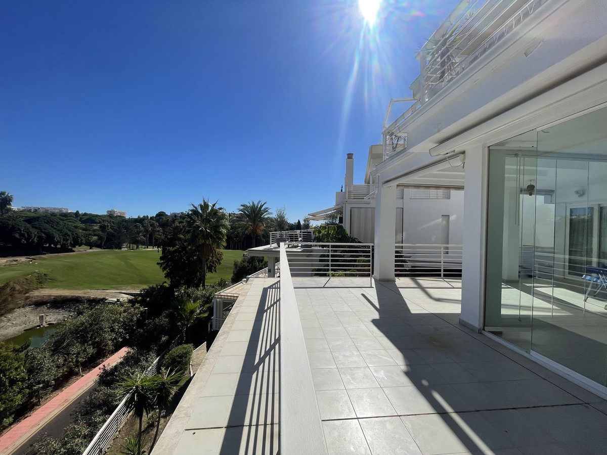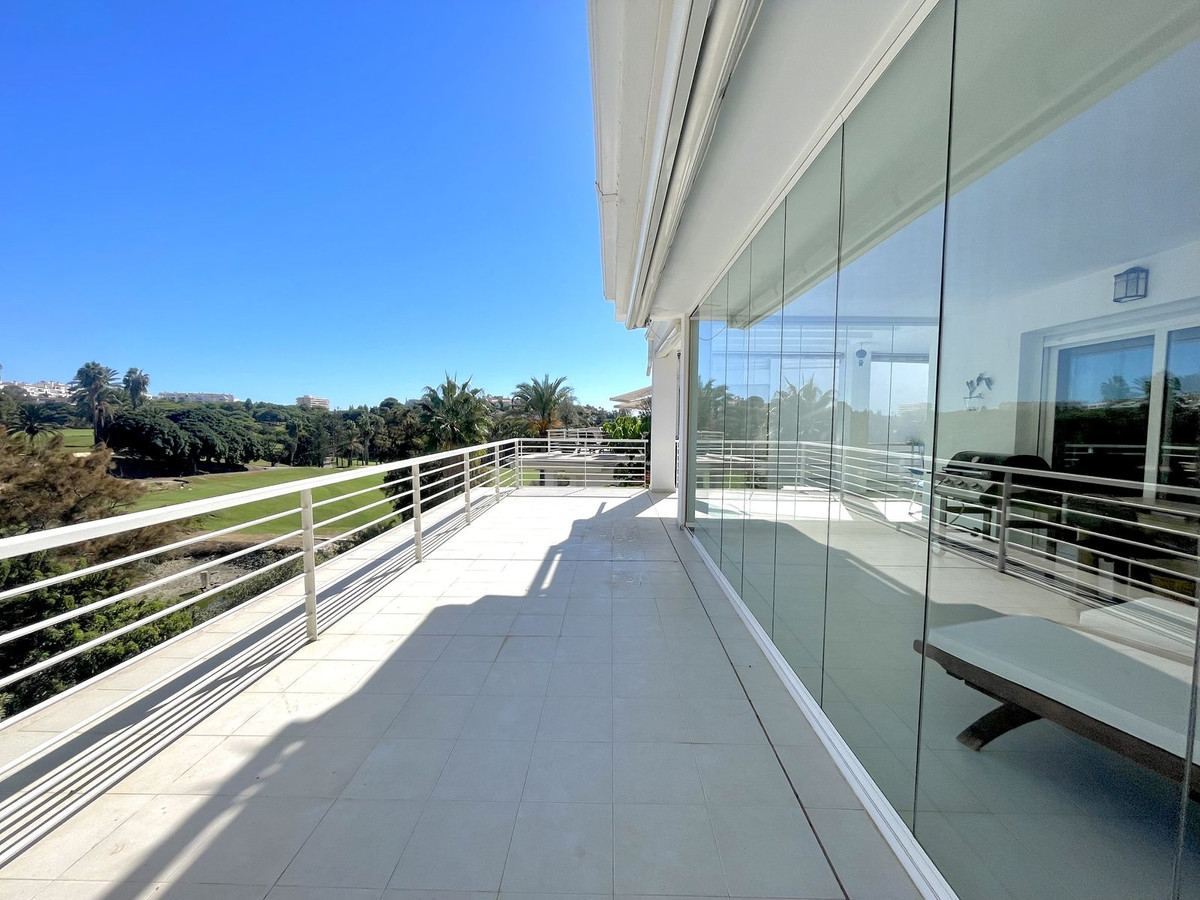 The apartment comprises of three generous double bedrooms, each with direct access to a terrace — either at the front or rear of the property. Two well-appointed bathrooms, both with large walk-in showers, serve the home, one of which is an en-suite to the master bedroom.To the left of the entrance hall, double doors open into a large, inviting living area featuring a fireplace and floor-to-ceiling windows that flood the space with natural light. These windows open onto what truly sets this property apart — an expansive wrap-around terrace. Partially enclosed with bifold windows to ensure year-round enjoyment, this incredible outdoor space offers panoramic views across the golf course and the surrounding countryside.