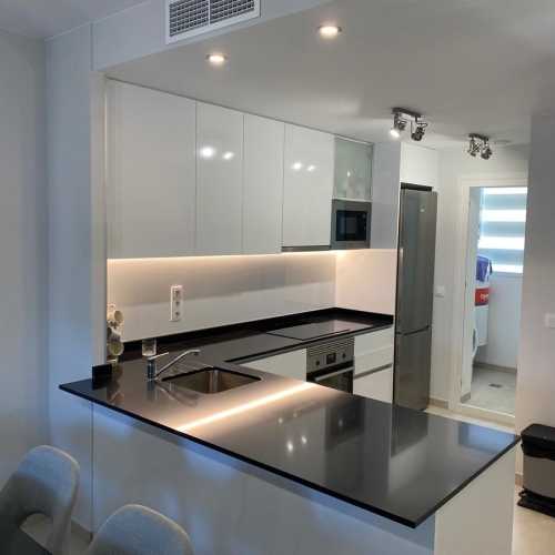Zeniamar is a familiar name to many who are looking for housing in Orihuela Costa. It is located in the heart of the Orihuela Costa, between Playa Flamenca and La Zenia, and not too far from the coast, An entire neighborhood consisting of 10 phases, built about 20 years ago by a renowned developer who is still one of the largest housing developers in the area. Zeniamar is known for well-kept condominiums with lush gardens and beautiful pool areas. This home is located in Zeniamar phase 6 and consists of 3 bedrooms with wardrobes, 2 bathrooms, living/dining area and a fully fitted kitchen with utility room. The property benefits from a very large sunny terraced area, underground garage, air conditioning and is sold furnished.