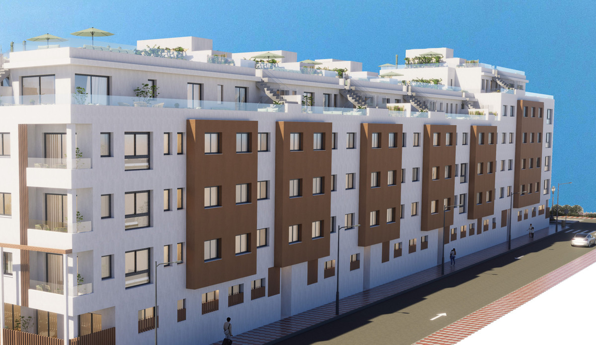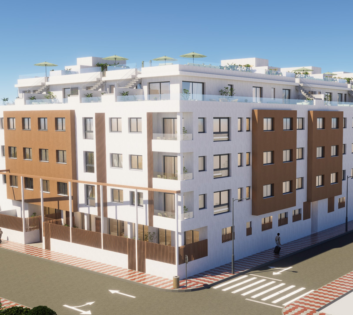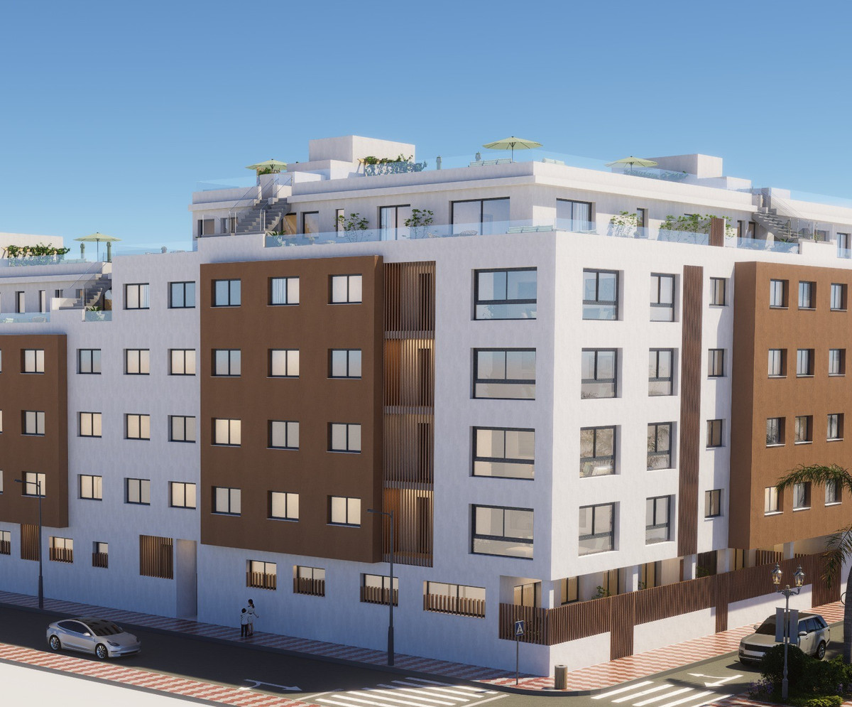 Beläget i Roquetas de Mar presenterar komplexet sig som en modern byggnad med rena linjer och högkvalitativa material, som kombinerar nutida estetik med hållbarhet.