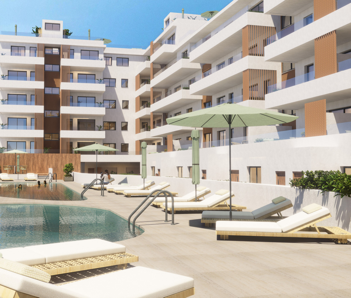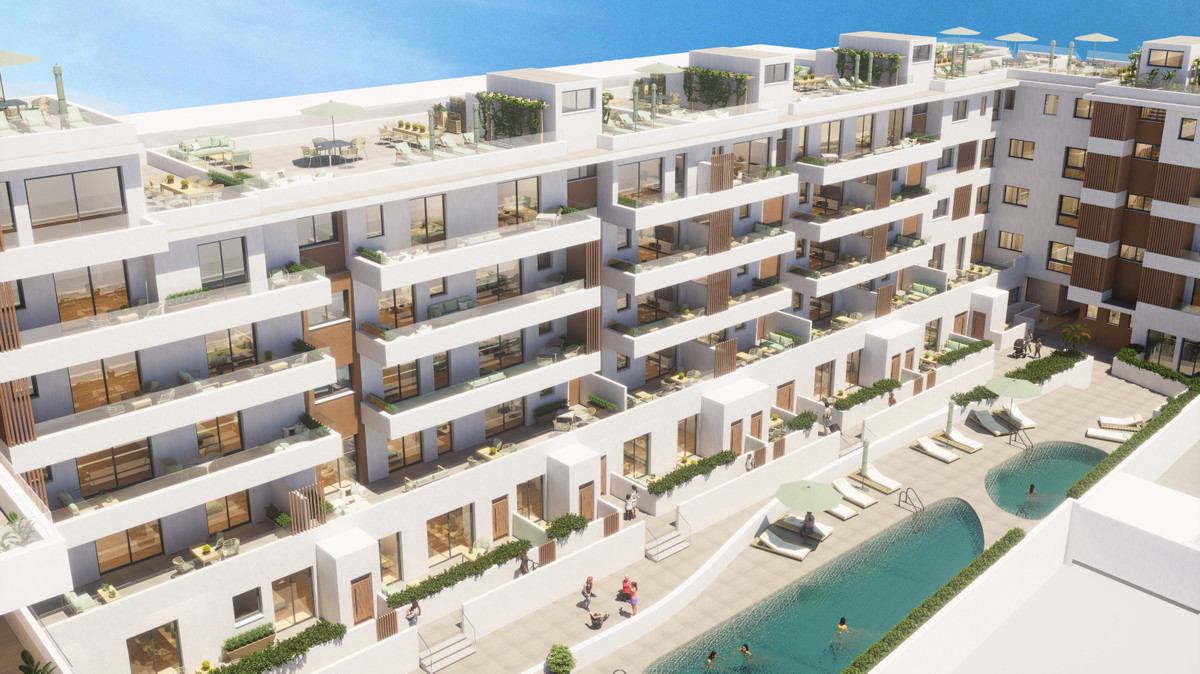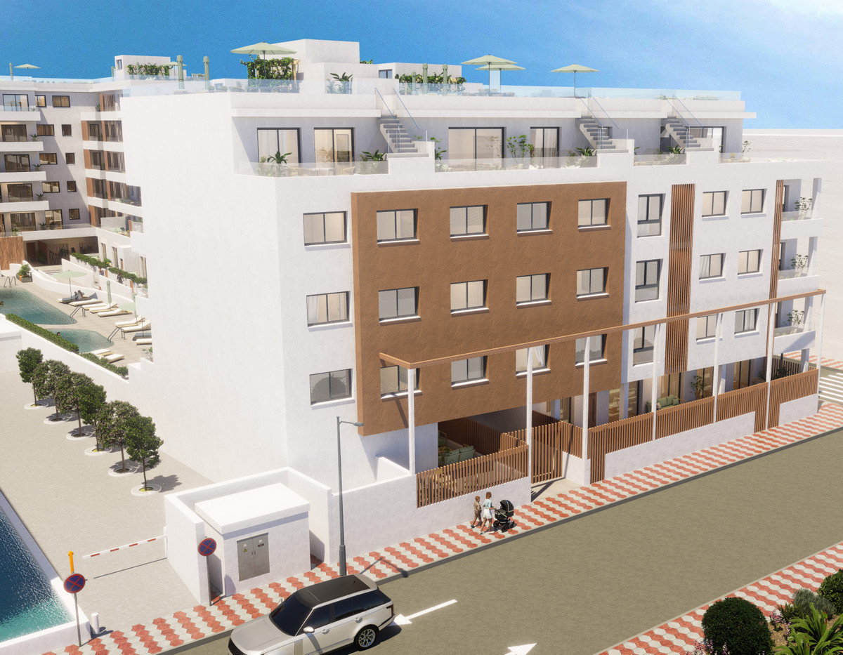 Beläget i Roquetas de Mar presenterar komplexet sig som en modern byggnad med rena linjer och högkvalitativa material, som kombinerar nutida estetik med hållbarhet.