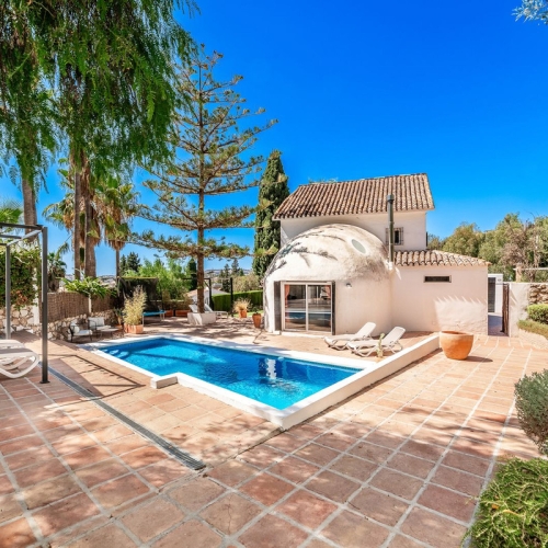 Stunning typical Andalusian 200m2 south-facing villa on one floor, partly renovated in 2024, offers sea views and is located in a very popular area of Riviera del Sol in very quiet street, just a 15-minute walk from the beach and 10 minutes from restaurants, bars, and supermarkets.