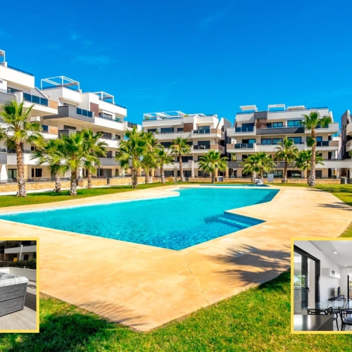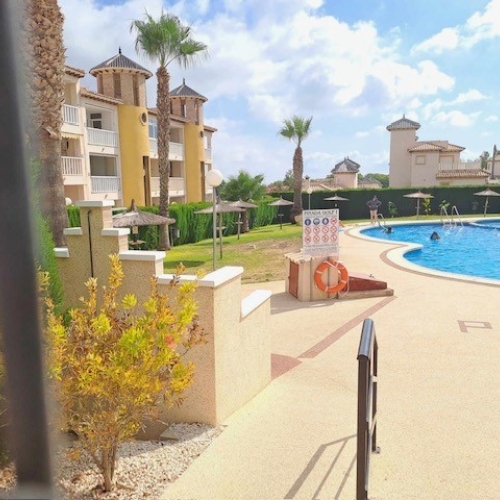 Lägenheten ligger i ett vackert underhållet område med tre pooler (varav en uppvärmd), en barnpool och lekplats, med anlagda trädgårdar som de boende kan njuta av.