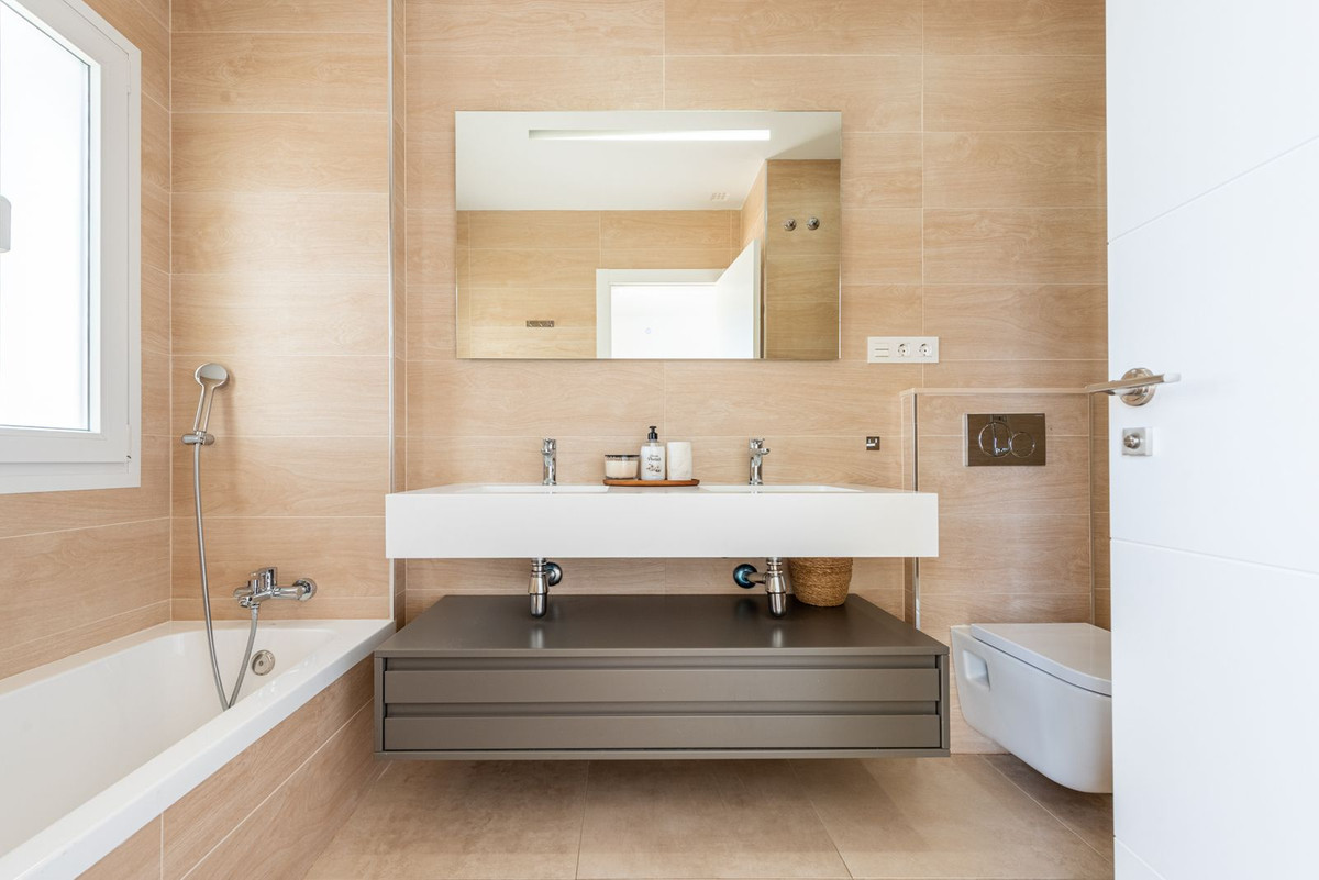 A floating staircase leads up to a 3 bedroom level with 2 bathrooms with underfloor heating. This level also offers access to a stunning solarium with pergola.