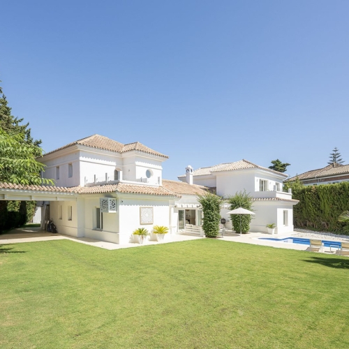 Welcome to Villa Indira. A spacious 509 m² villa located in the prestigious Zona B of Sotogrande. The property sits on a private 1,125 m² plot and offers 5 bedrooms, 4 bathrooms, a secluded garden, a large swimming pool, and a carport. Built in a classic Andalusian style, the villa has authentic charm and character. With some updating, it holds the potential to become a truly spectacular family home in one of Southern Spain's most exclusive communities.