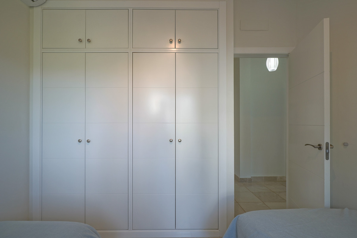 The upper floor houses three spacious double bedrooms, all with built-in wardrobes. The master bedroom has an en-suite bathroom, while the other two bedrooms share a full bathroom. The en-suite bedroom and another bedroom have direct access to a terrace with spectacular views, the perfect place to relax while watching the sunrise or sunset over the Mediterranean.
