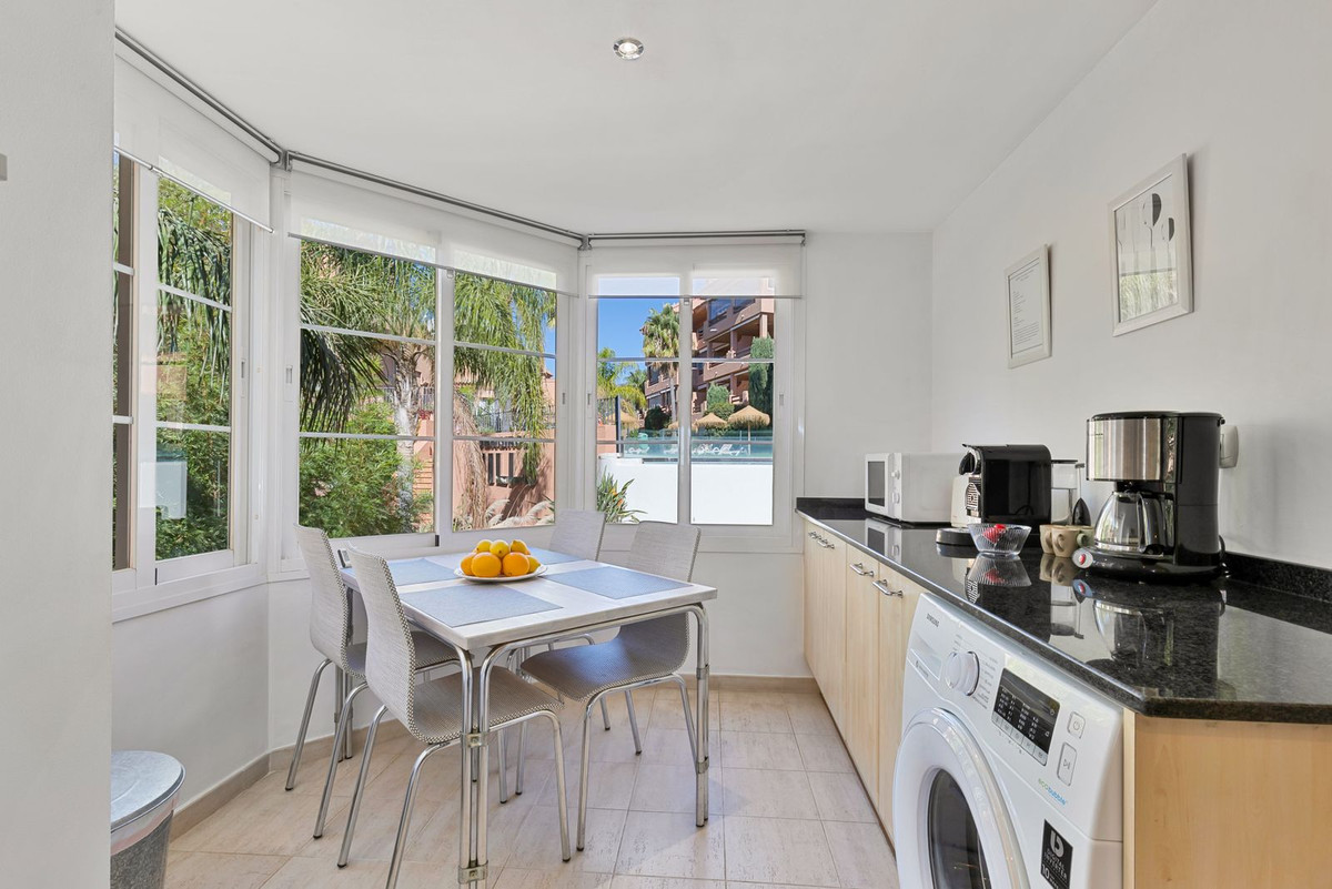 Till höger finns ett fullt utrustat kök med matplats och stora fönster ut mot den gemensamma trädgården och en av områdets pooler. \n\n
