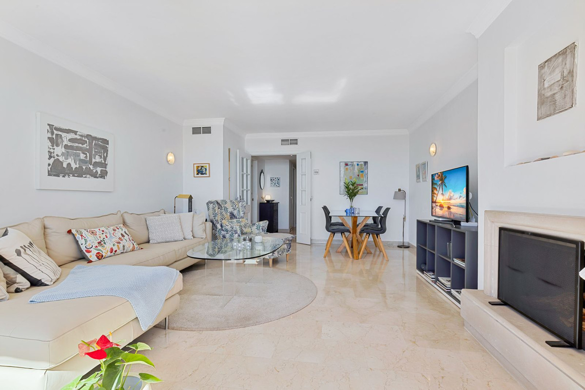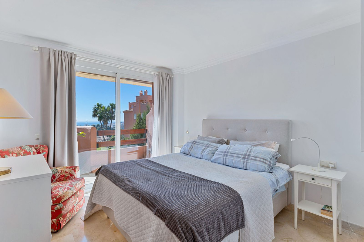 Till vänster från hallen finns vardagsrummet med öppen spis och glasdörrar ut mot terrassen på 22 m2 med platsbyggd soffa och plats för matbord, grill och växter. Och sa vi att terrassen bjuder på en fantastisk utsikt ner mot havet och Fuengirola?!\n\n