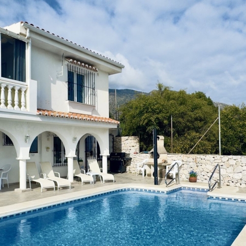 LARGE ANDALUSIAN VILLA situated on a quiet gated cul-de-sac just outside Mijas Pueblo. Boasts privacy in a peaceful location, only a 5-minute drive from town center. South orientation in a very private setting. Large private swimming pool with terrace surround, BBQ area, mature gardens with fruit trees, a storage cupboard and a gardener's shed. There is a garage with extra parking space on spacious driveway. Lovely front covered porch with pillars. Beautiful mountain views and partial sea views from top floor.