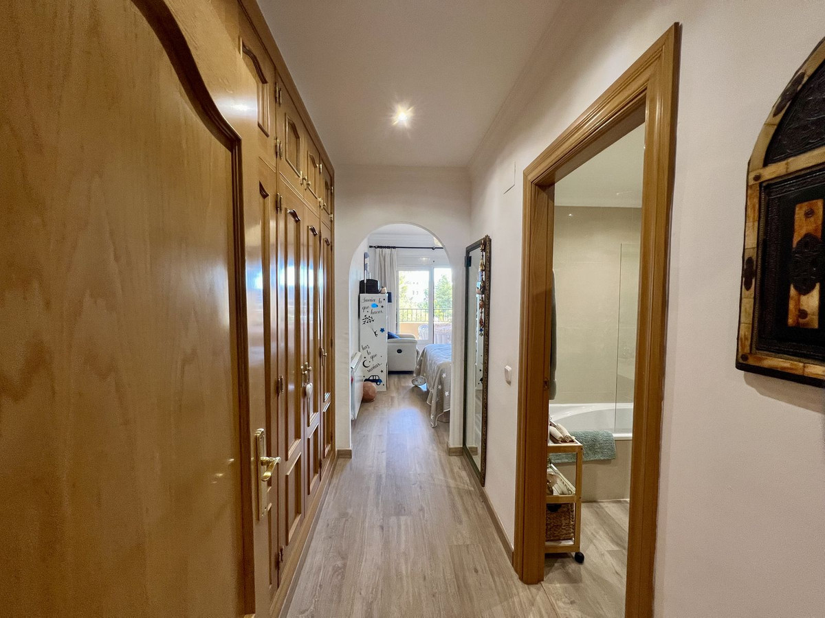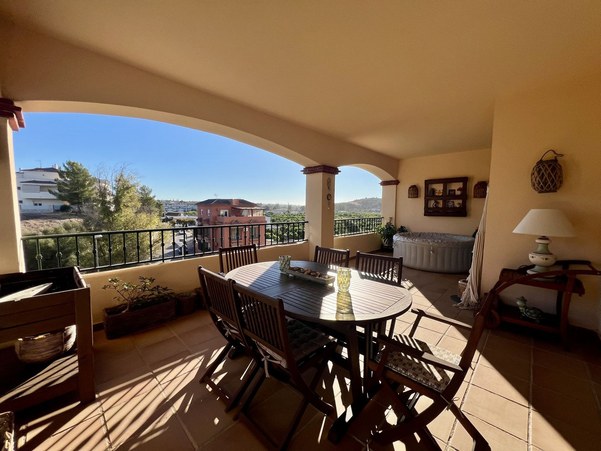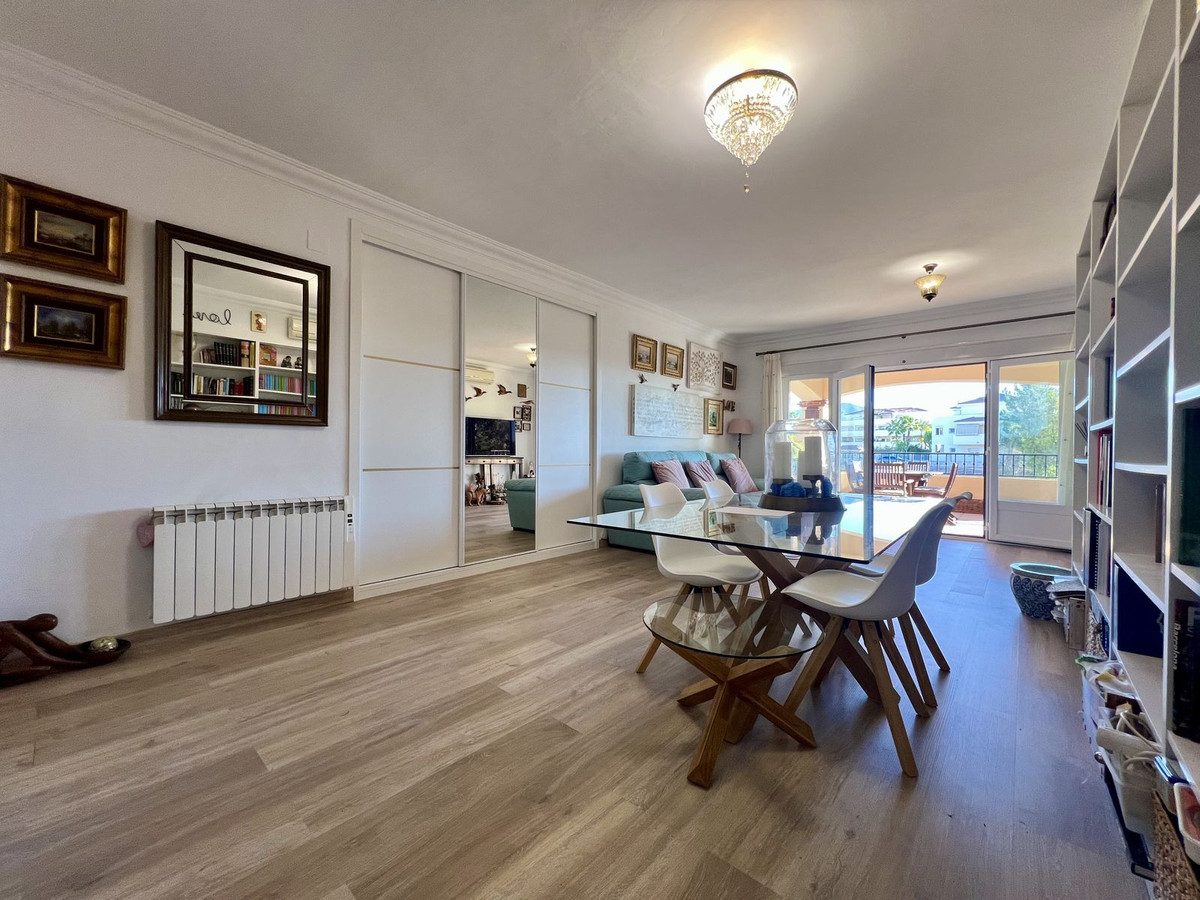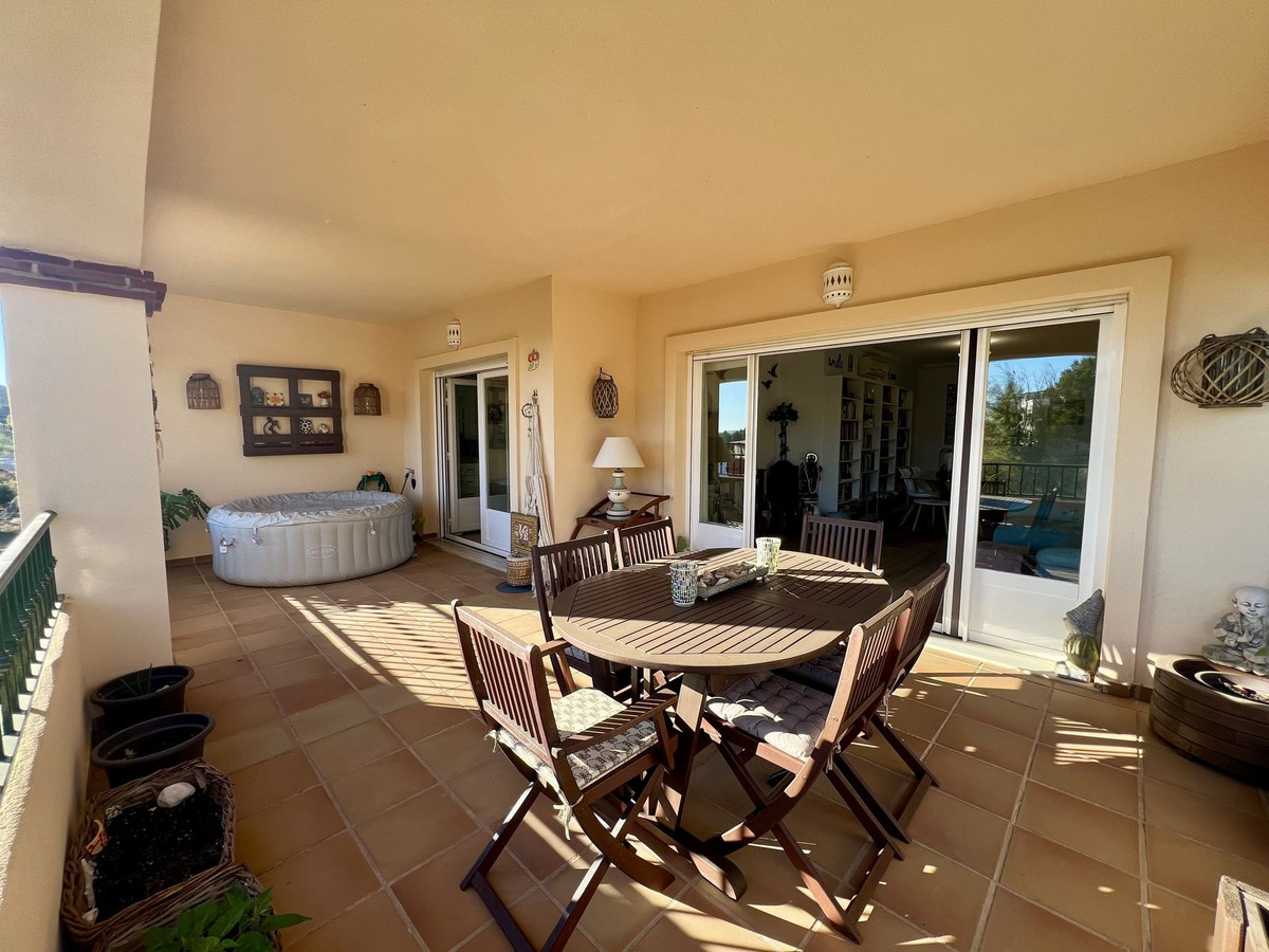 The terrace enjoys a north-to-northeast orientation, providing morning sun and pleasant shade during the warmer hours of the day. From here, there is direct access to the communal garden and swimming pool, both beautifully maintained and ideal for relaxing.