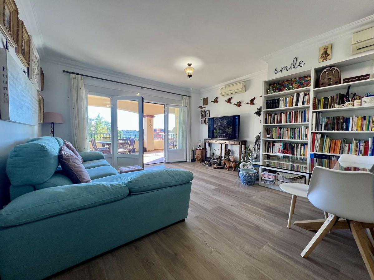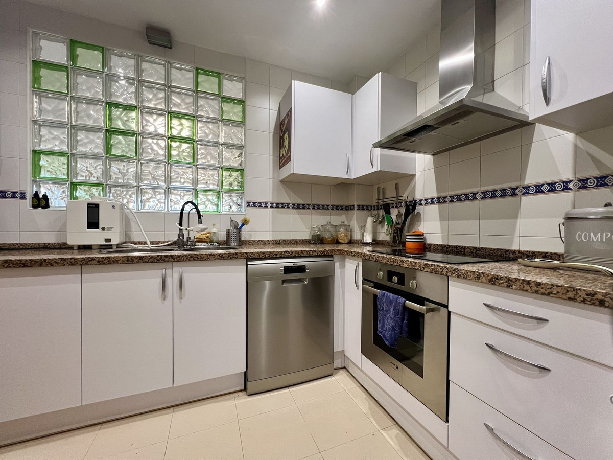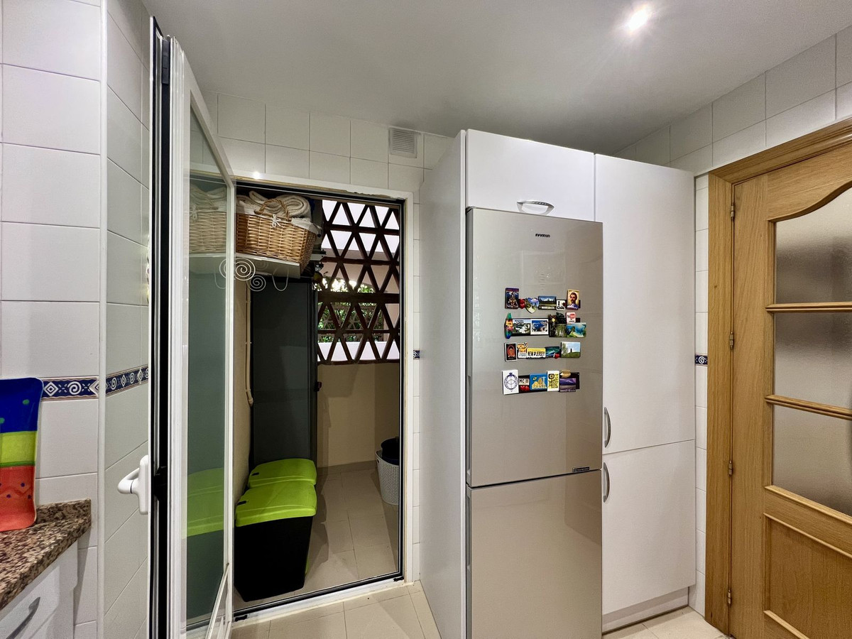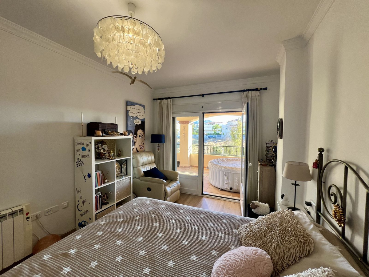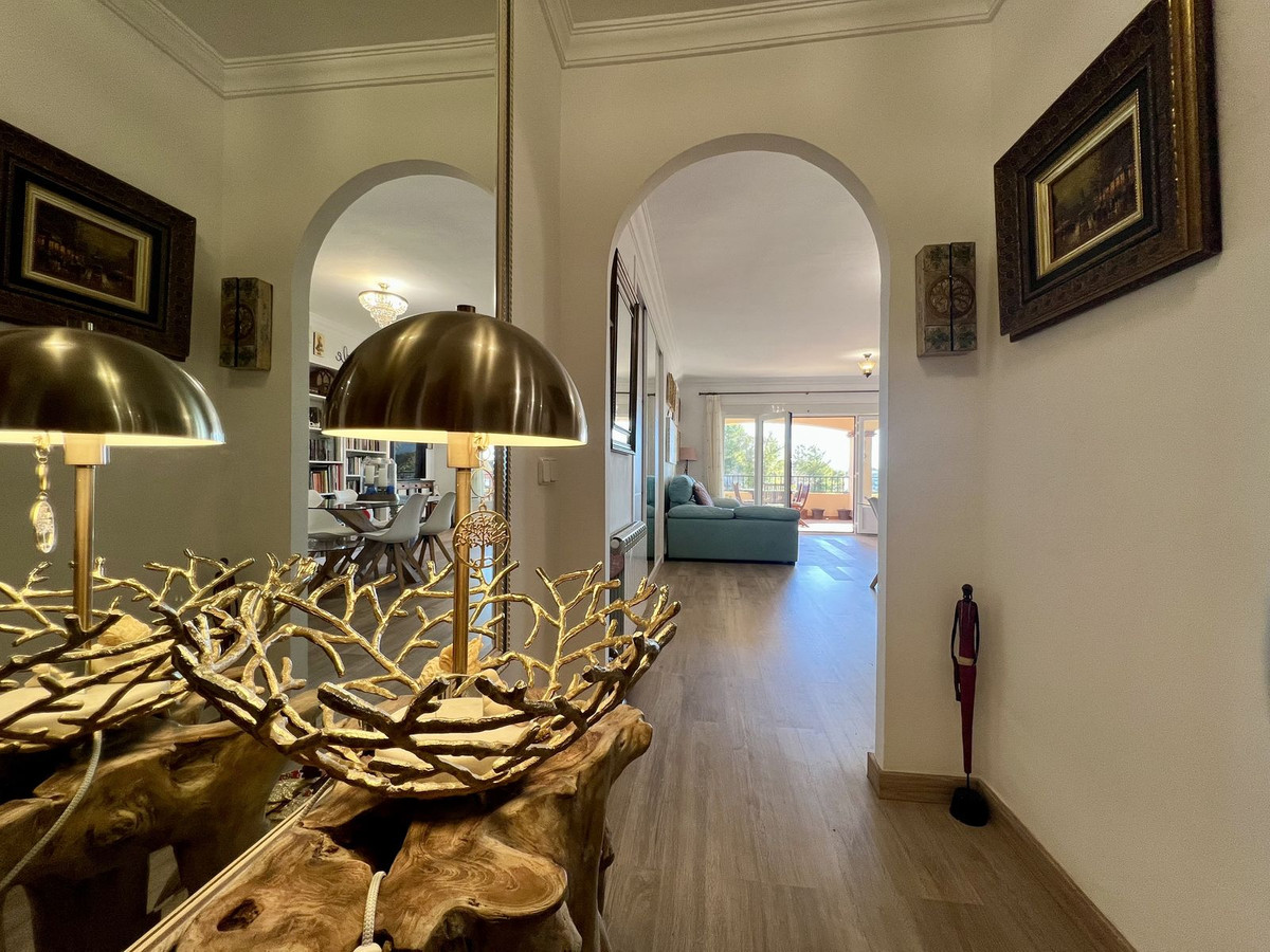 The terrace enjoys a north-to-northeast orientation, providing morning sun and pleasant shade during the warmer hours of the day. From here, there is direct access to the communal garden and swimming pool, both beautifully maintained and ideal for relaxing.