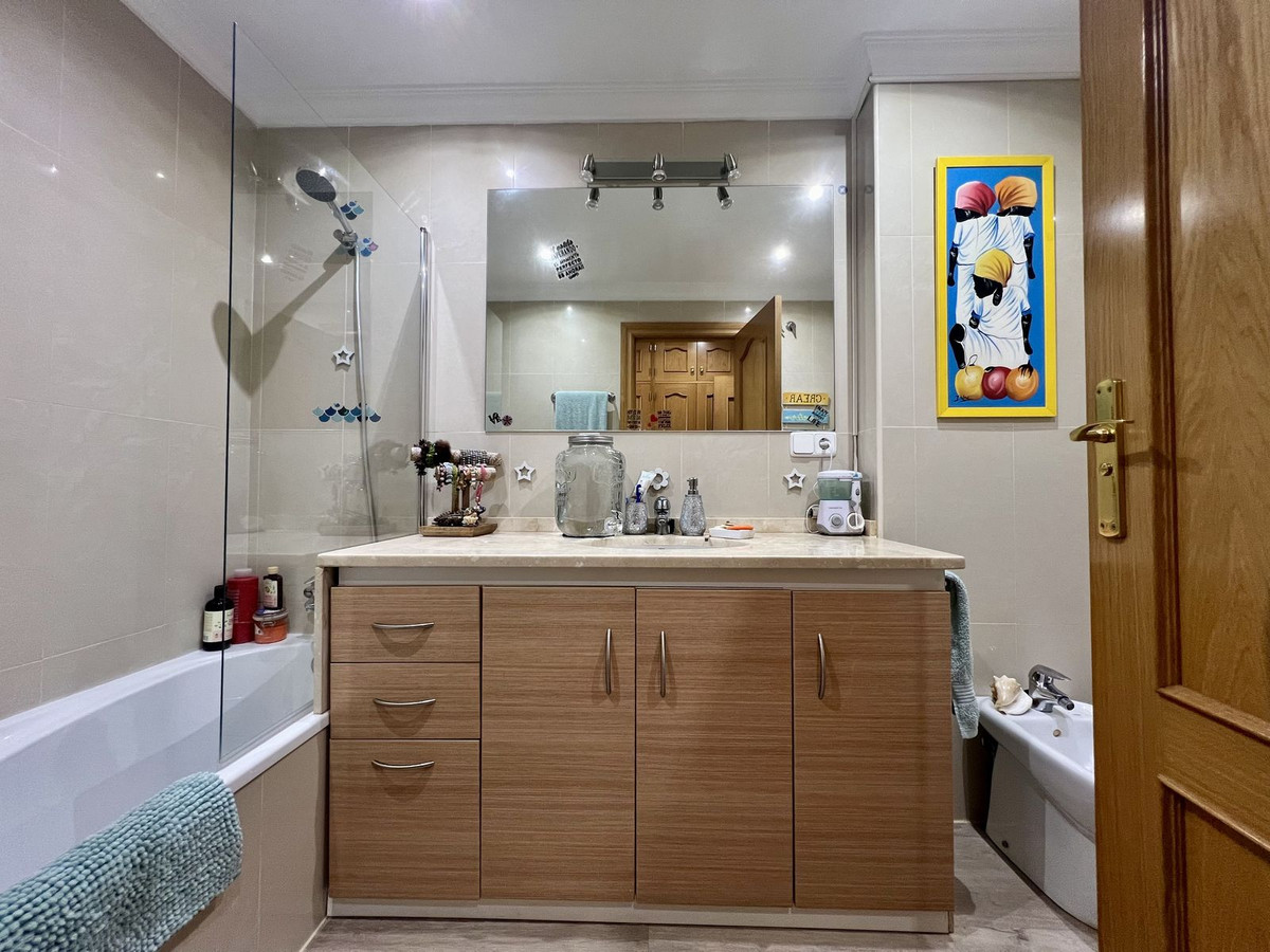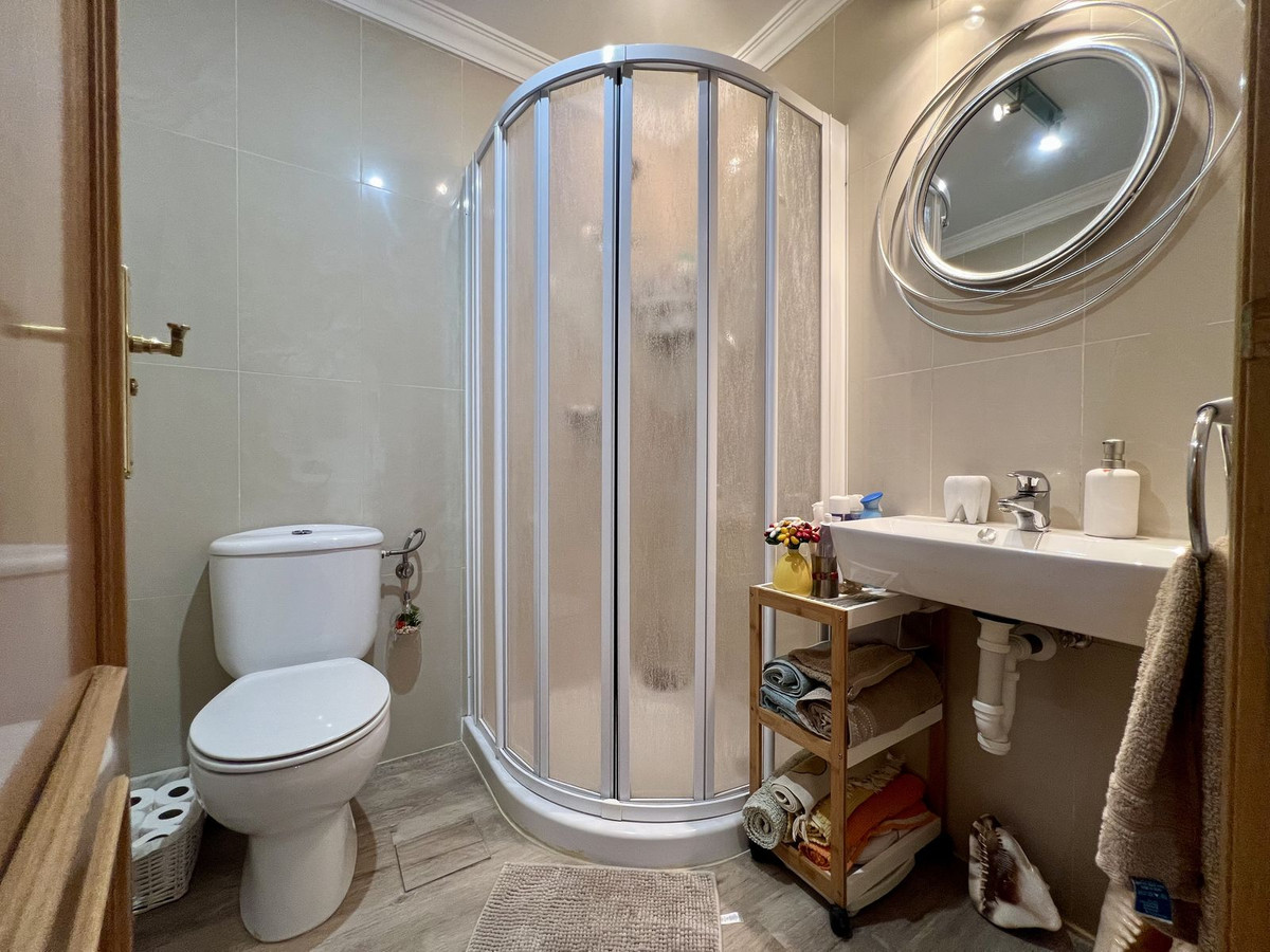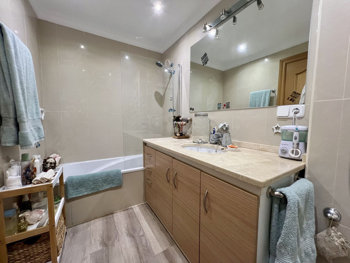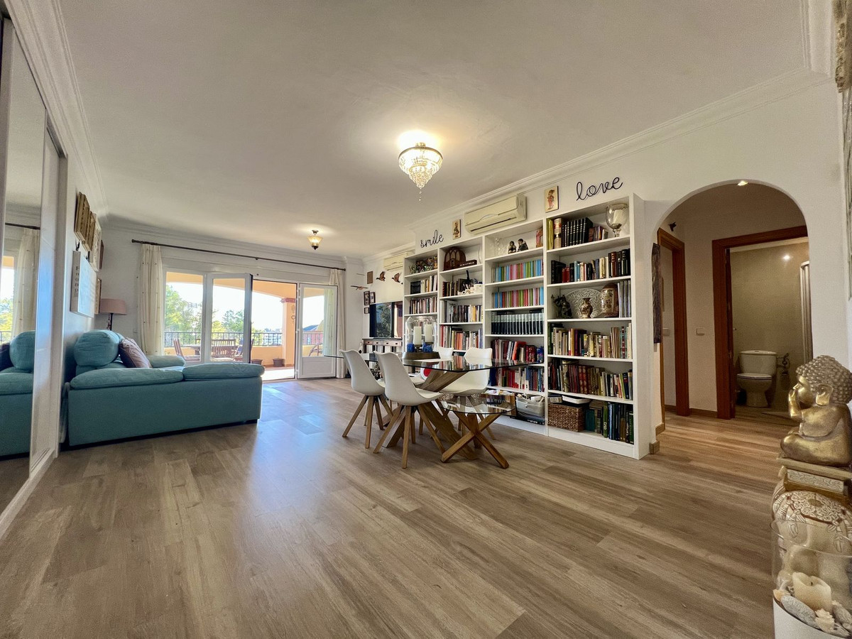 The terrace enjoys a north-to-northeast orientation, providing morning sun and pleasant shade during the warmer hours of the day. From here, there is direct access to the communal garden and swimming pool, both beautifully maintained and ideal for relaxing.
