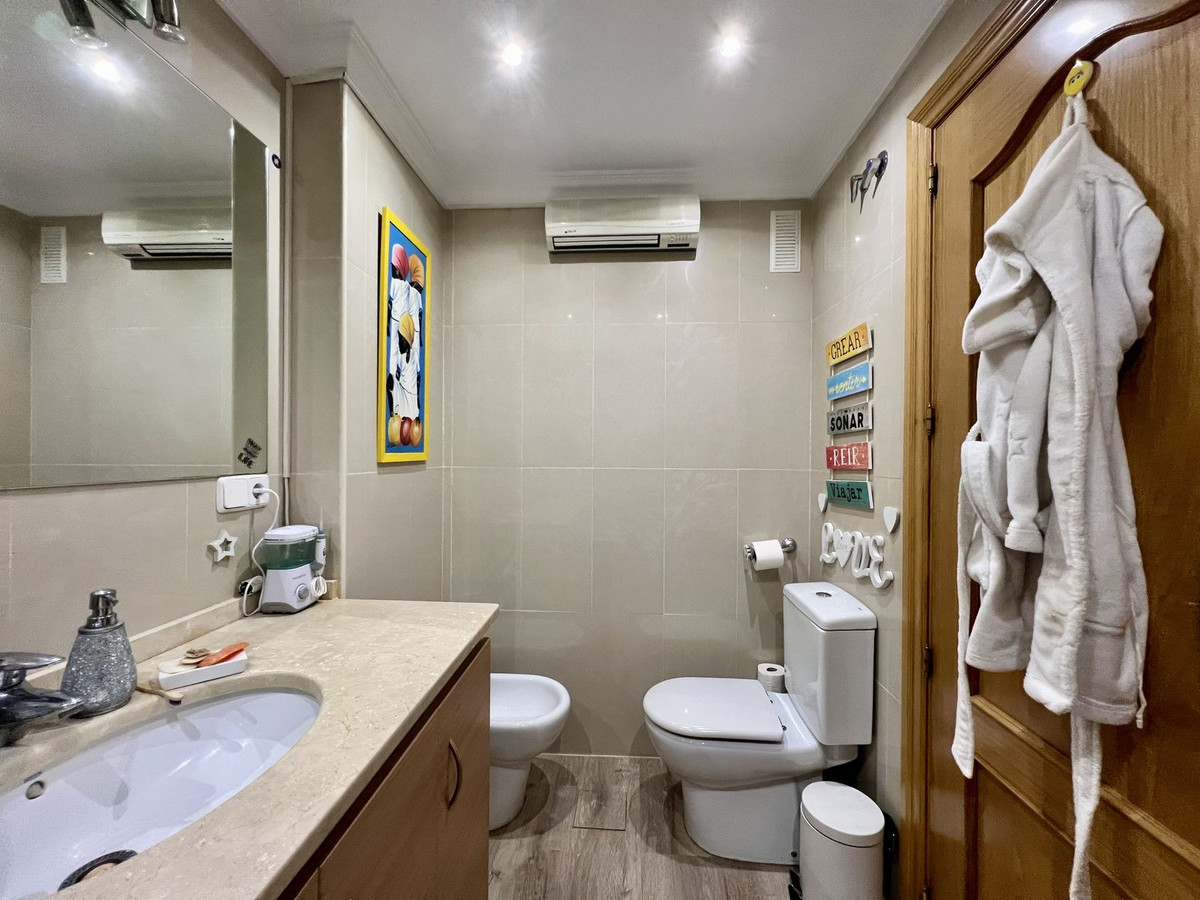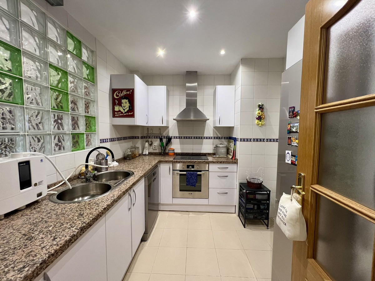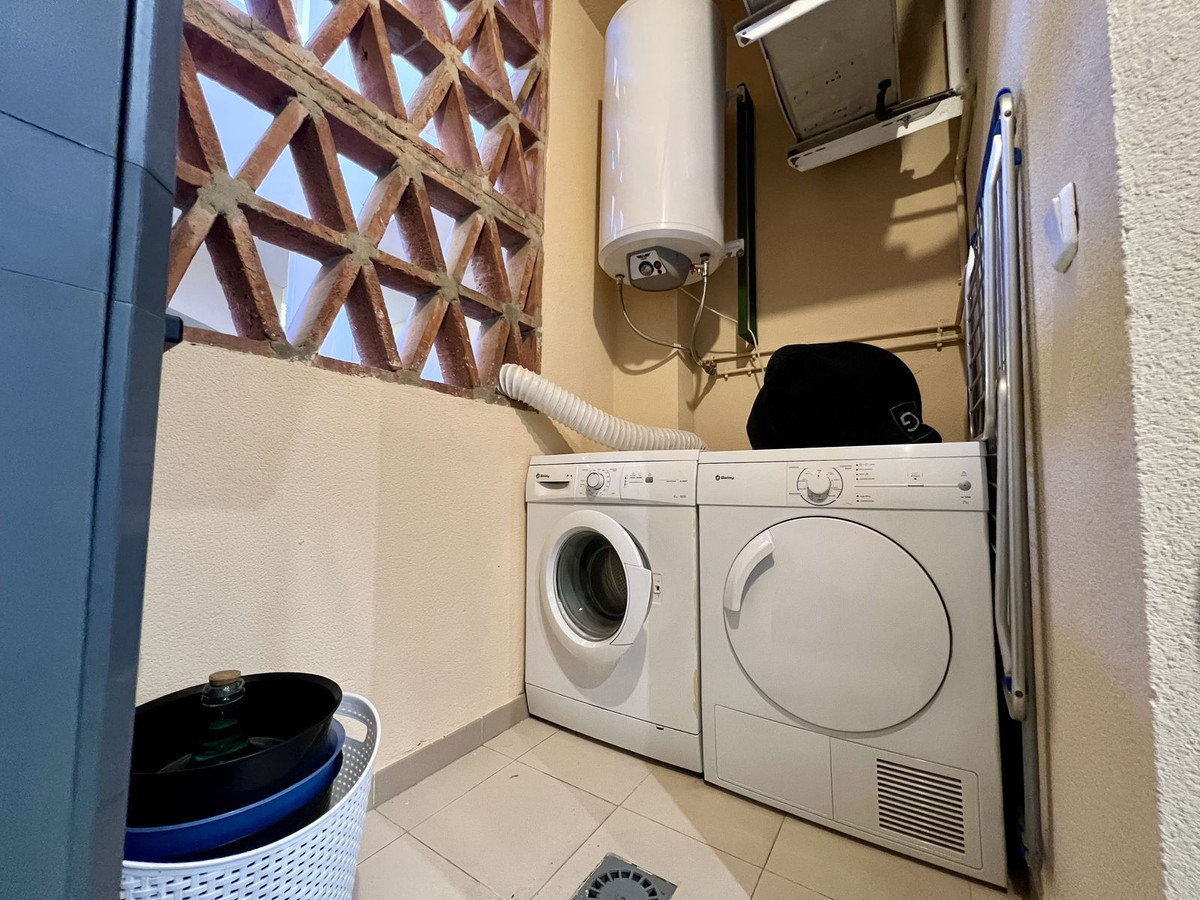 The apartment has a total built area of approximately 122 m², including a 30 m² terrace. It features two bedrooms and two bathrooms, a fully fitted kitchen with separate utility room, and a bright living and dining area with direct access to the terrace.