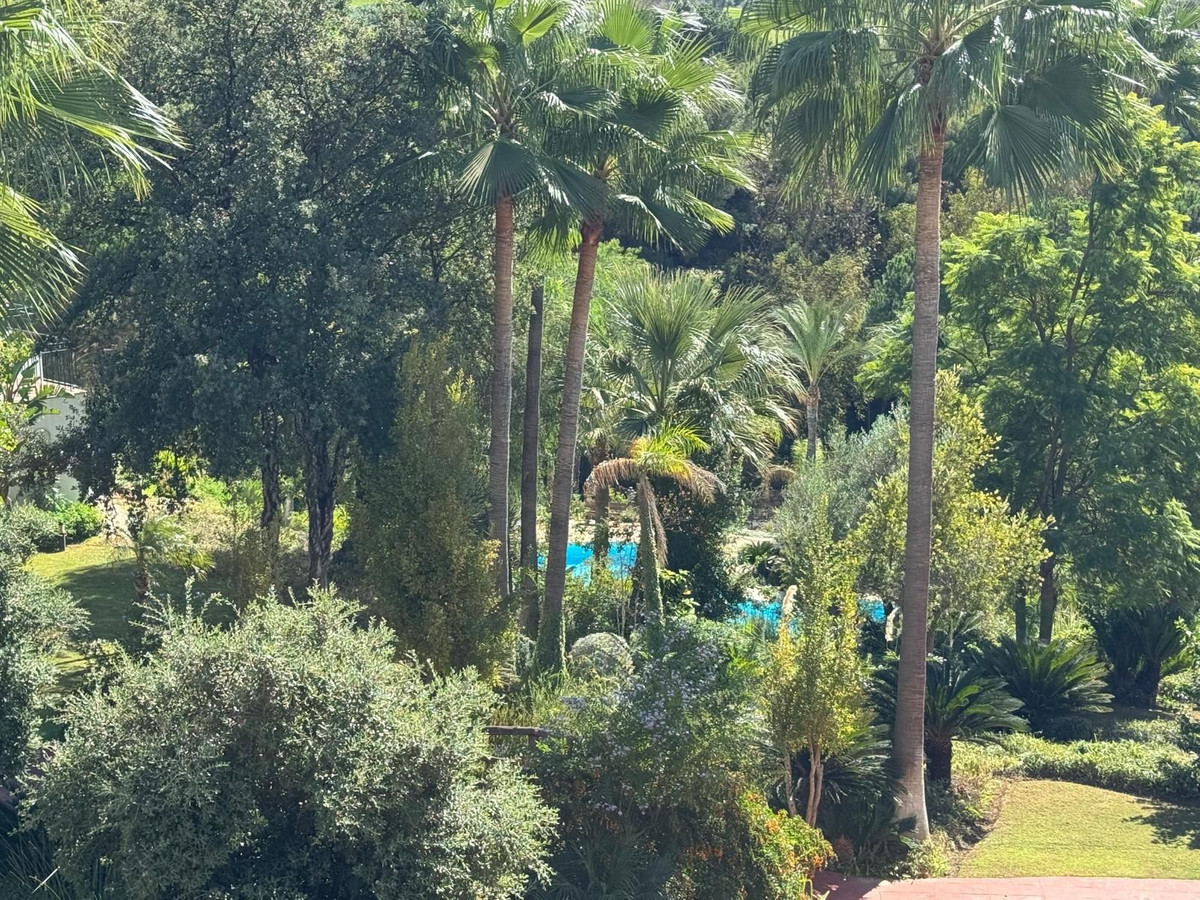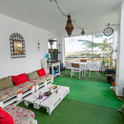 To your left, a recently refurbished, fully equipped kitchen features modern fittings and a new water boiler. From here, step out onto a charming covered terrace — a peaceful spot for morning coffee under the soft sun, with uninterrupted views of mature greenery and the fairways of Alhaurín Golf. Sheltered from the intense afternoon heat, it's also an inviting retreat for summer relaxation.