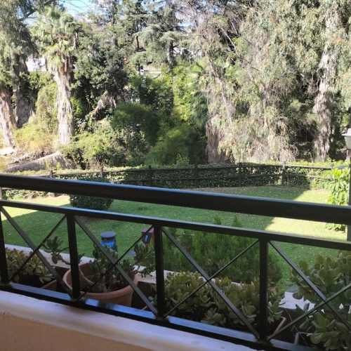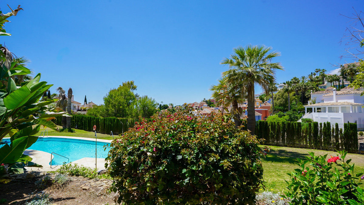 The apartment features two spacious bedrooms and two sleek, modern bathrooms, all recently refurbished to the highest standards. The open-plan living and dining area flows effortlessly onto a private covered terrace with serene garden and pool views—ideal for alfresco dining or relaxing in the sun. High-quality double glazing, air conditioning, and a modern alarm system ensure year-round comfort and security, while fitted wardrobes offer generous storage.